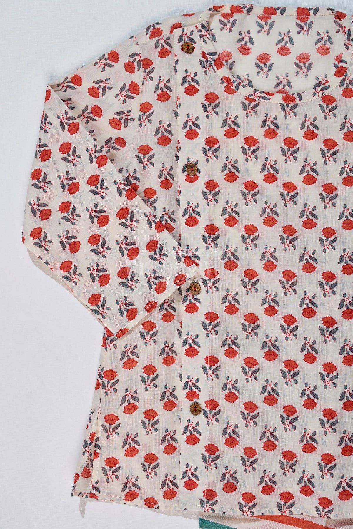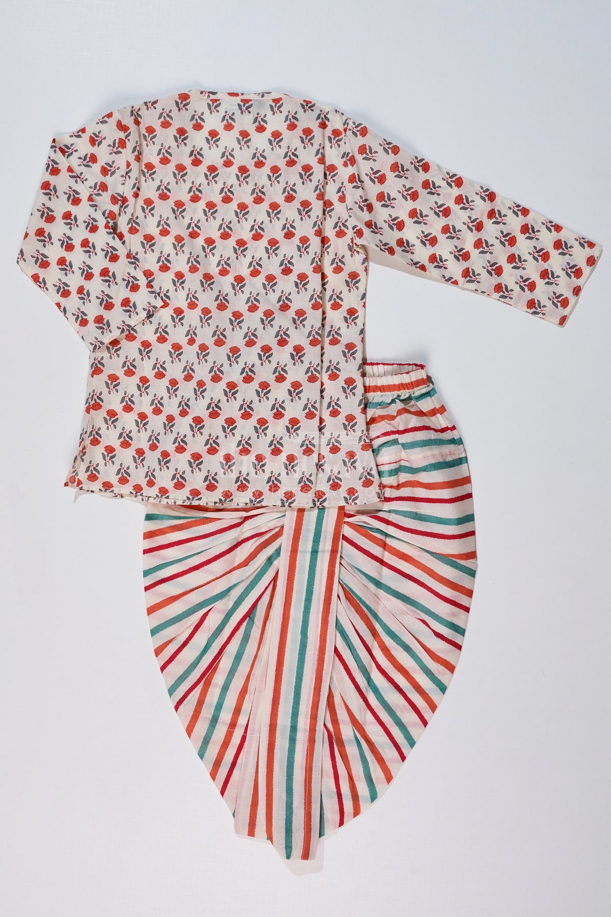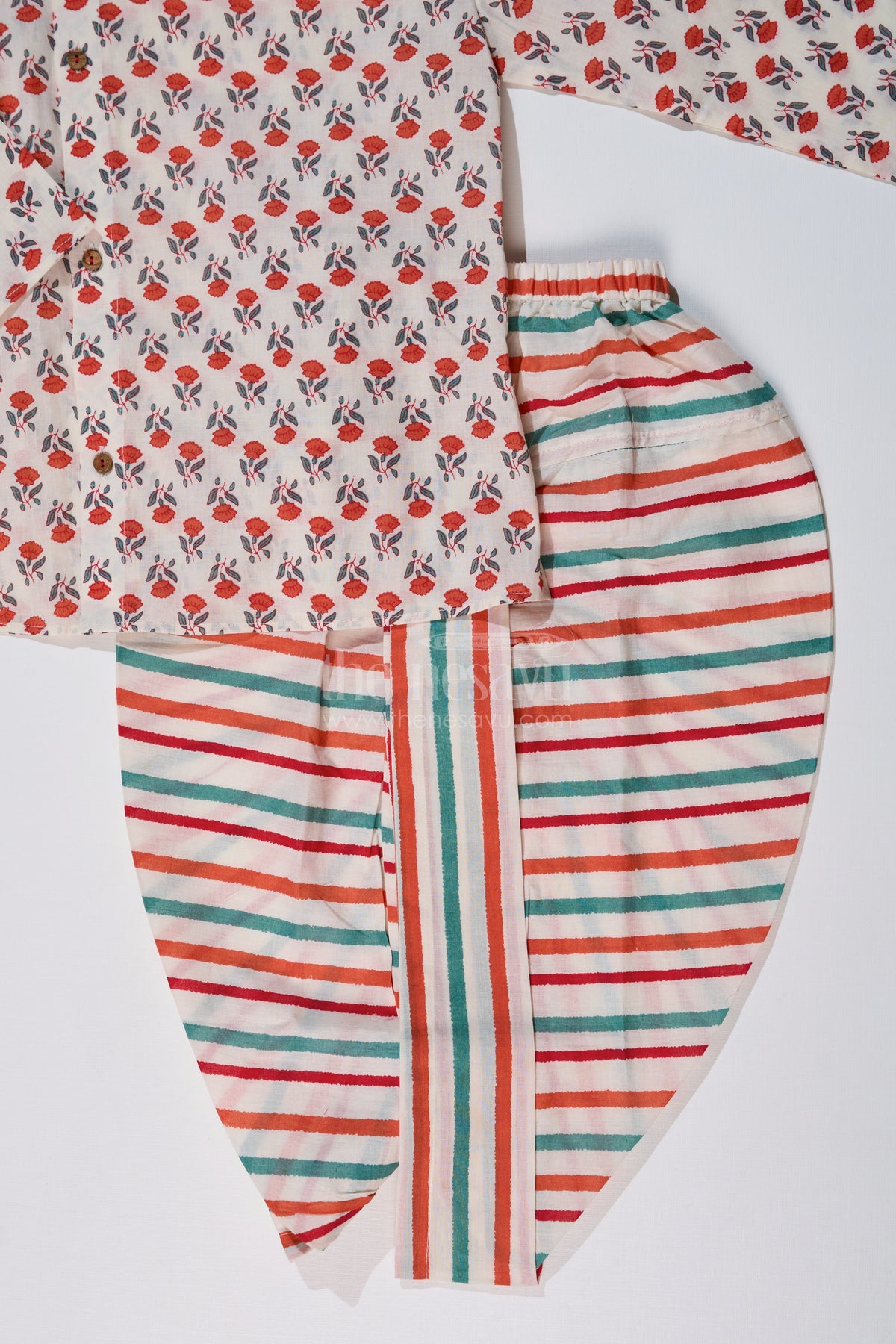 This readymade dhoti kurta is a festive must-have, blending comfort with traditional style. The cream-colored kurta is decorated with red floral block prints, adding a vibrant touch to the outfit. Paired with a striped red and multicolor dhoti, this set brings a refreshing and stylish look to ethnic wear. Designed in soft, breathable cotton, this outfit is perfect for cultural celebrations, family gatherings, and festive occasions, ensuring both style and comfort for your little one.