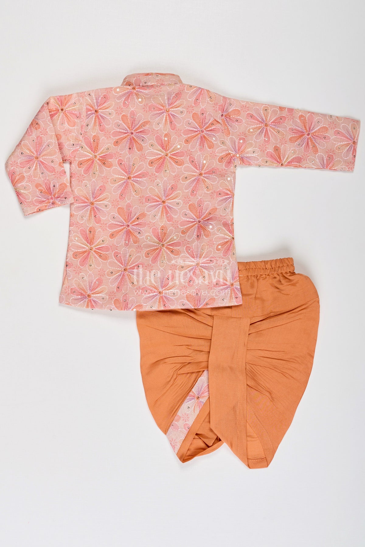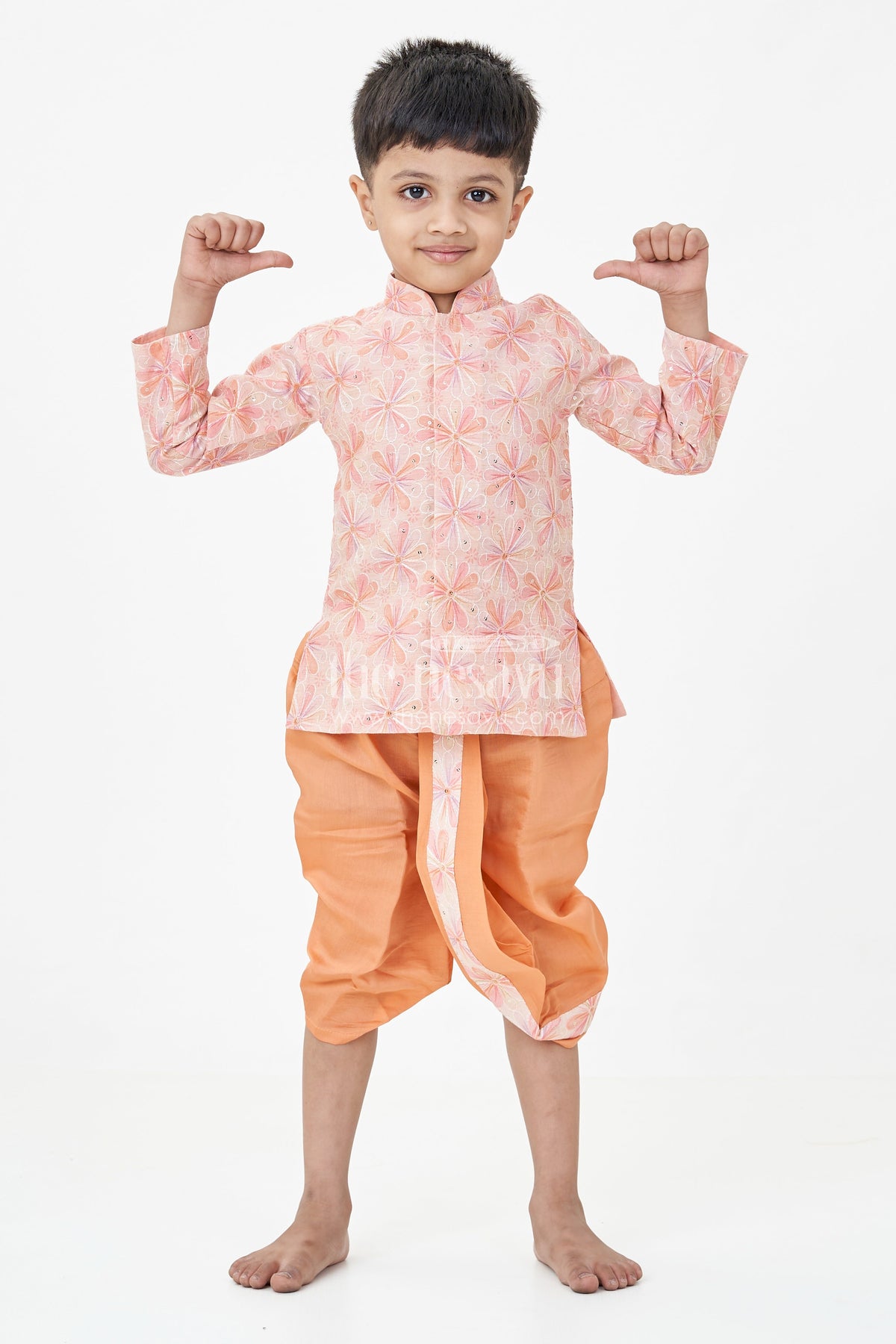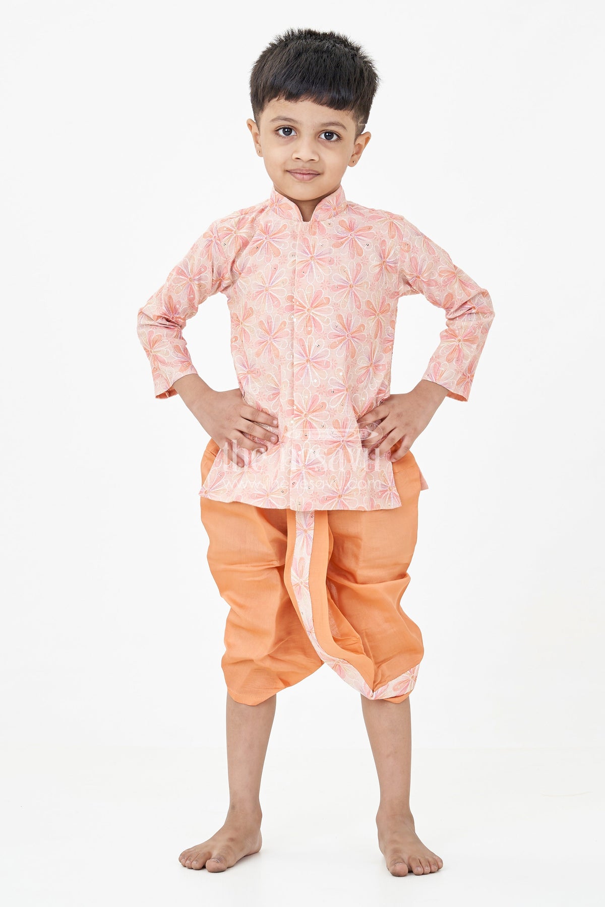 Celebrate traditions in style with this best dhoti kurta design for boys, perfect for festive occasions and family events. The kurta features a stunning floral thread embroidery in shades of peach, pink, and white, made from a soft and breathable cotton blend fabric. The mandarin collar and full sleeves give it a smart and neat finish. Paired with a rich rust-orange dhoti featuring a matching embroidered strip in front, this set ensures both elegance and comfort for your child. Easy to wear and lightweight, it offers freedom of movement while making a bold traditional statement. This outfit is an ideal choice for temple visits, weddings, and cultural events where your little boy can shine in style.