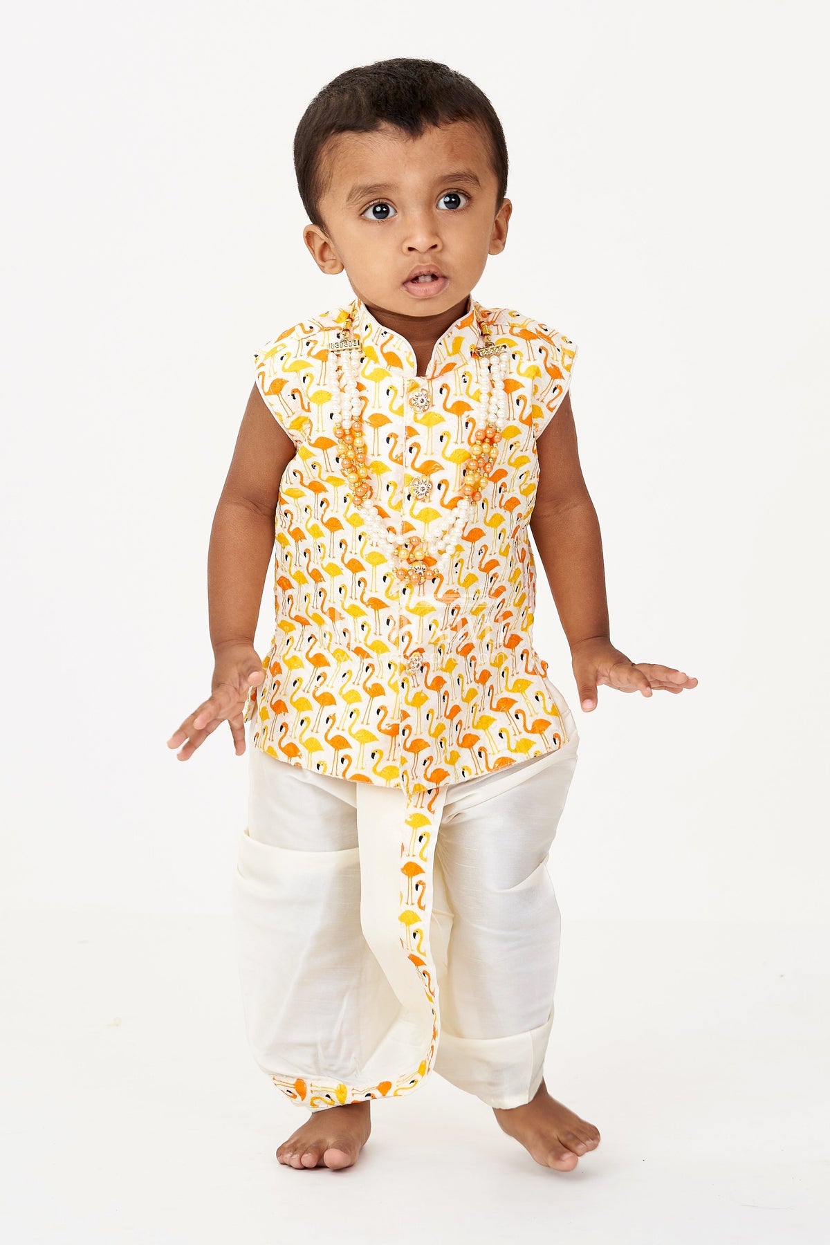 Boys Cotton Dhoti Pant Set with Yellow and Orange Flamingo Print Jacket in Cotton Blend
