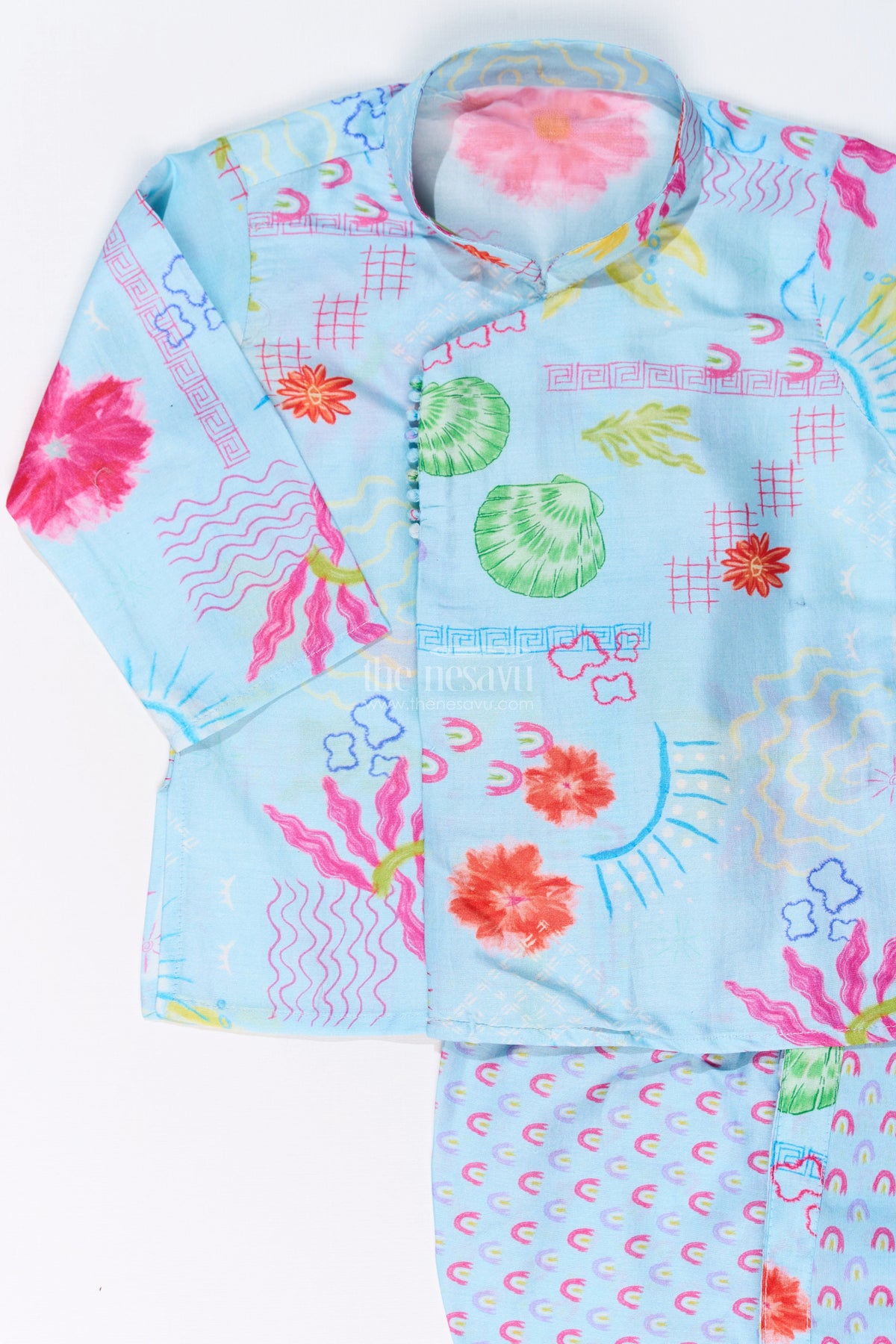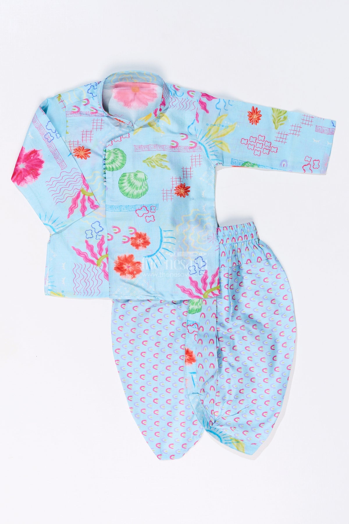 Dress your little one in this stylish dhoti kurta for kids, a perfect fusion of tradition and comfort. Designed with soft cotton fabric, this set features a charming floral print that adds a playful touch to its ethnic appeal. The kurta has a full-sleeved design, providing a comfortable fit, while the matching dhoti pants complete the traditional look. Ideal for festivals, family functions, and cultural events, this lightweight outfit ensures ease of movement while keeping your child stylish and comfortable all day long.
