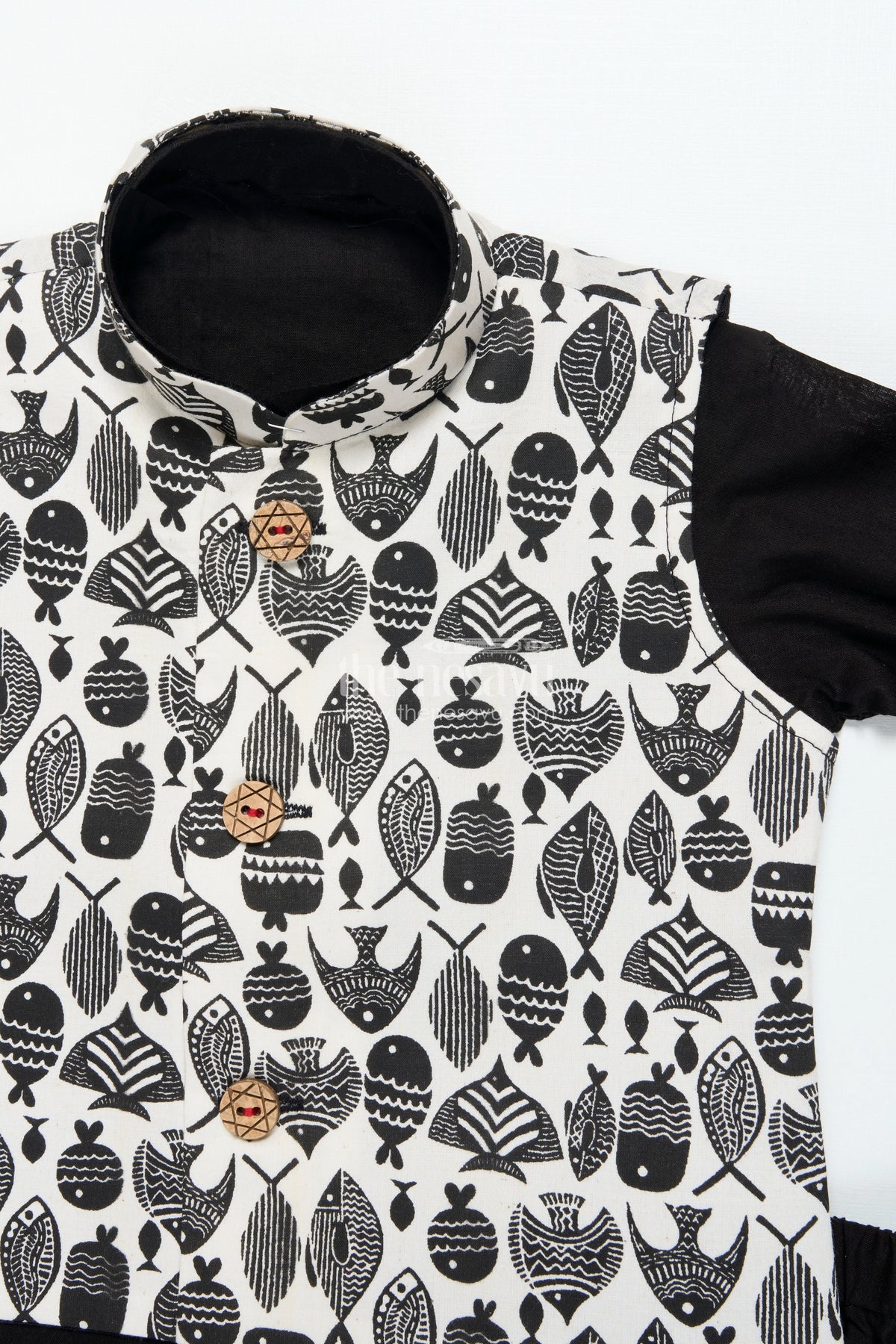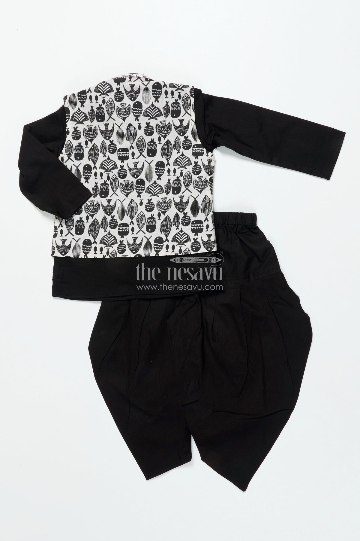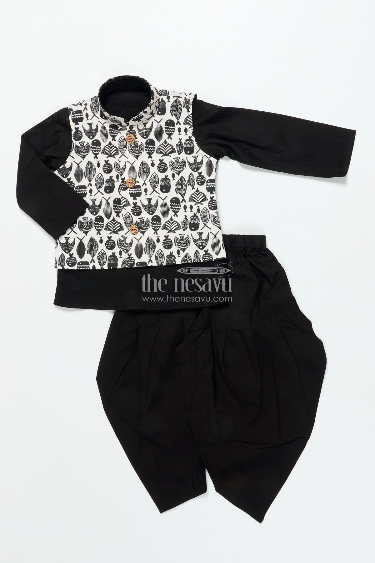 The Nesavu Boys Jacket Sets Boys Festive Jacket Set with Digital Print for Weddings and Birthdays Nesavu 12 (3M) / Black BES717A-12 Nesavu boys silk blend festive jacket set digital print birthday ethnic celebrations