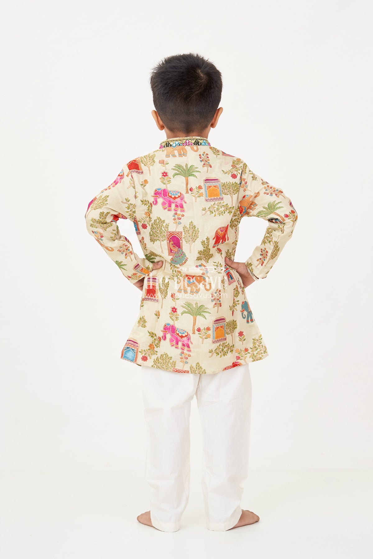 This traditional kurta dhoti pant set is a festive must-have for boys who love to dress in ethnic charm. The kurta is designed in pure viscose tissue fabric with digital prints of majestic elephants, temples, peacocks, and floral trees—evoking a rich cultural aesthetic. It features delicate mirror work on the neckline and a mandarin collar for added elegance. Paired with cream dhoti-style pants for comfort and authenticity, this outfit is perfect for temple visits, weddings, and special cultural occasions.