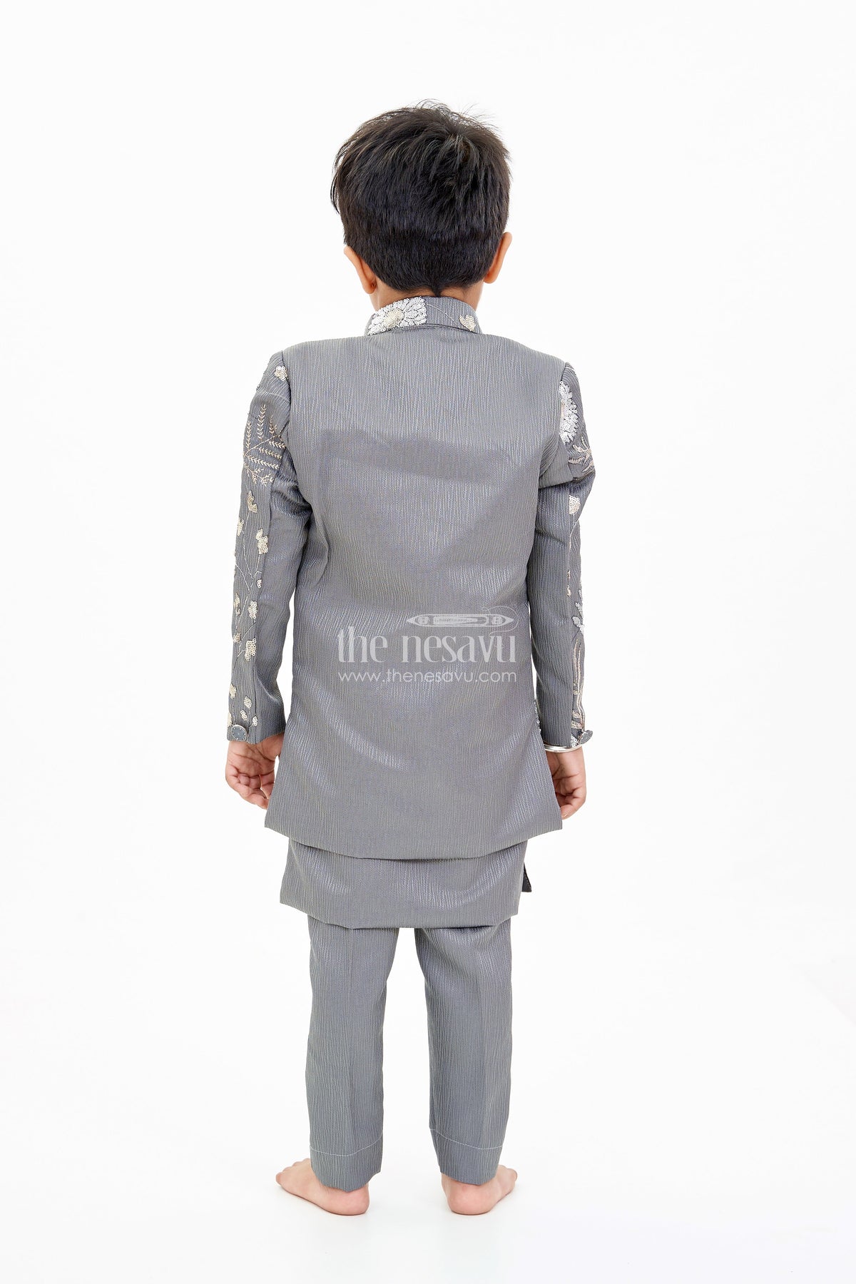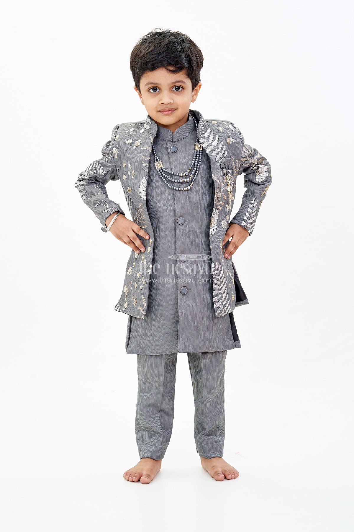 This sherwani with long jacket is a sophisticated outfit designed for boys who love traditional elegance. Made from a premium silk blend, this set features an intricately embroidered floral long jacket in deep charcoal with silver and gold accents. The coordinated kurta and pants complete the regal look, while the designer brooch and pocket square add a touch of class. The structured silhouette and full-sleeve jacket make it perfect for weddings, festive celebrations, and cultural events, ensuring your little one looks charming and stylish.