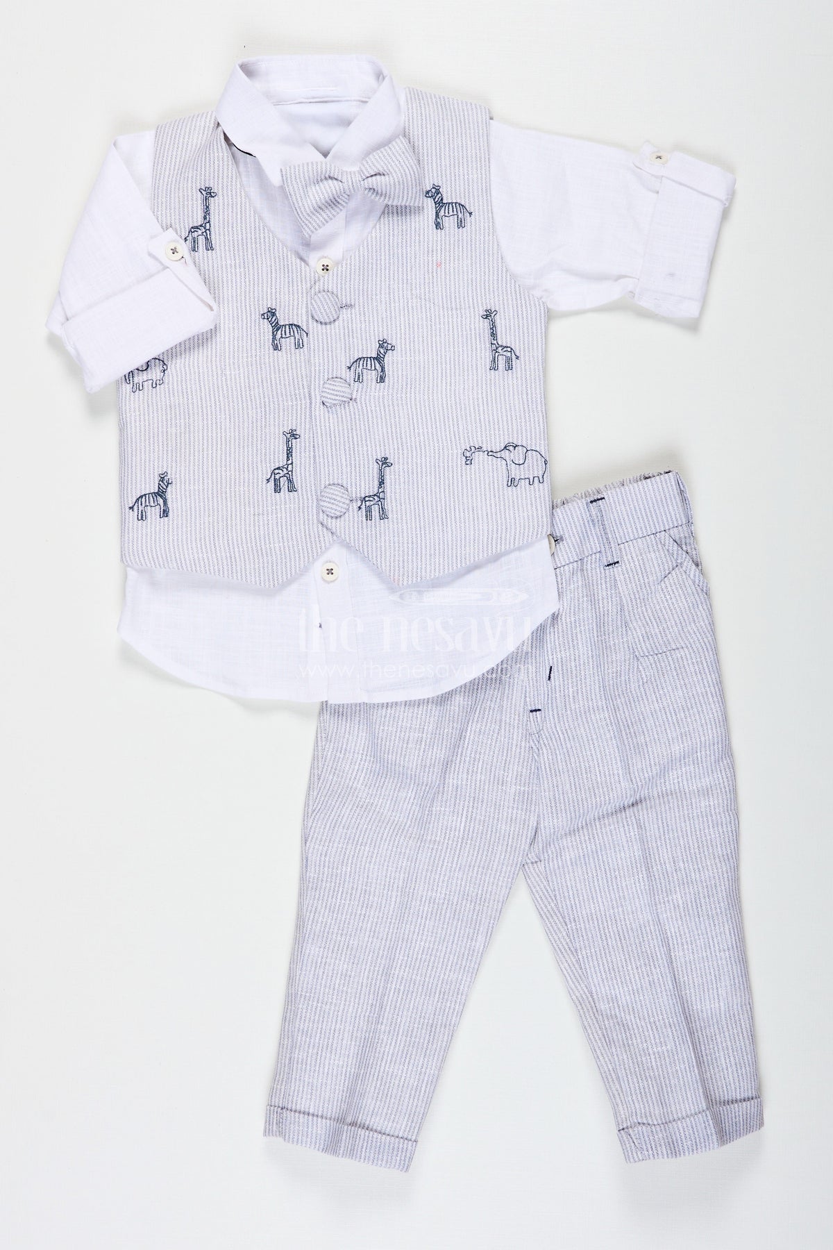 Designers shirts get a fashionable twist in this Nesavu boys jacket set crafted in breathable cotton. The outfit features a white full-sleeve shirt paired with finely striped pants and an adorable animal digital print jacket. The jacket includes fun embroidered motifs like giraffes and elephants, giving it a playful safari vibe while maintaining a sleek, structured look. A coordinating bow tie adds a polished finish, making it perfect for stylish young trendsetters. Designed to offer ease of movement with soft fabrics and a classic button-down closure, this three-piece set blends charm with functionality—ideal for any casual or semi-formal occasion.