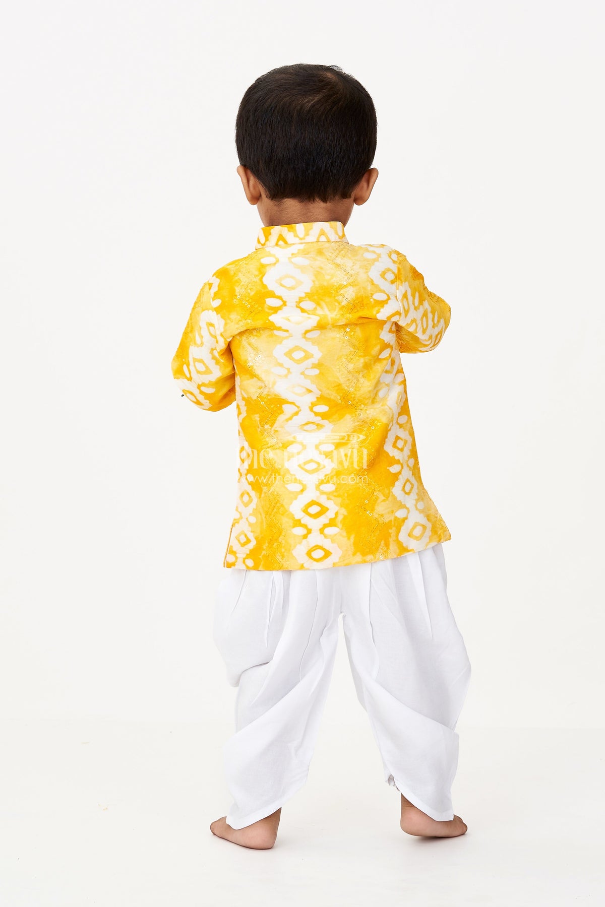 The dhoti for newborn is a thoughtfully crafted traditional set that blends soft textures and cultural charm. Made with Chanderi cotton, the yellow batik-printed jacket features light sequin embroidery and a unique cross-button style. Paired with a white soft dhoti bottom and matching accessories, this outfit is gentle on the skin and easy to wear. Perfect for naming ceremonies, milestone photos, or traditional family gatherings, it ensures your newborn shines in heritage-inspired style.