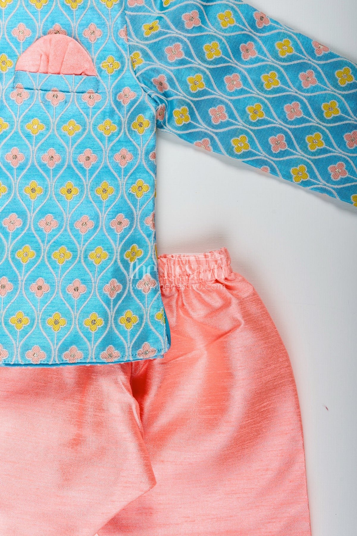 - Eye-catching pastel peach and blue color combination with pocket square adds festive charm