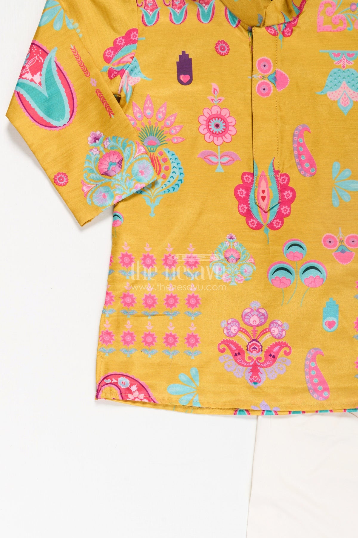Upgrade your boy’s ethnic wardrobe with this ethnic kurta set, tailored in breathable muslin silk. The mustard-yellow kurta features vibrant traditional prints in contrasting hues of pink, teal, and green, adding an artistic flair. Paired with sleek off-white pants, this outfit provides a festive-ready ensemble that balances style and comfort. Ideal for Pongal, Diwali, family gatherings, or birthday celebrations, the premium craftsmanship ensures durability while maintaining its softness for all-day wear.