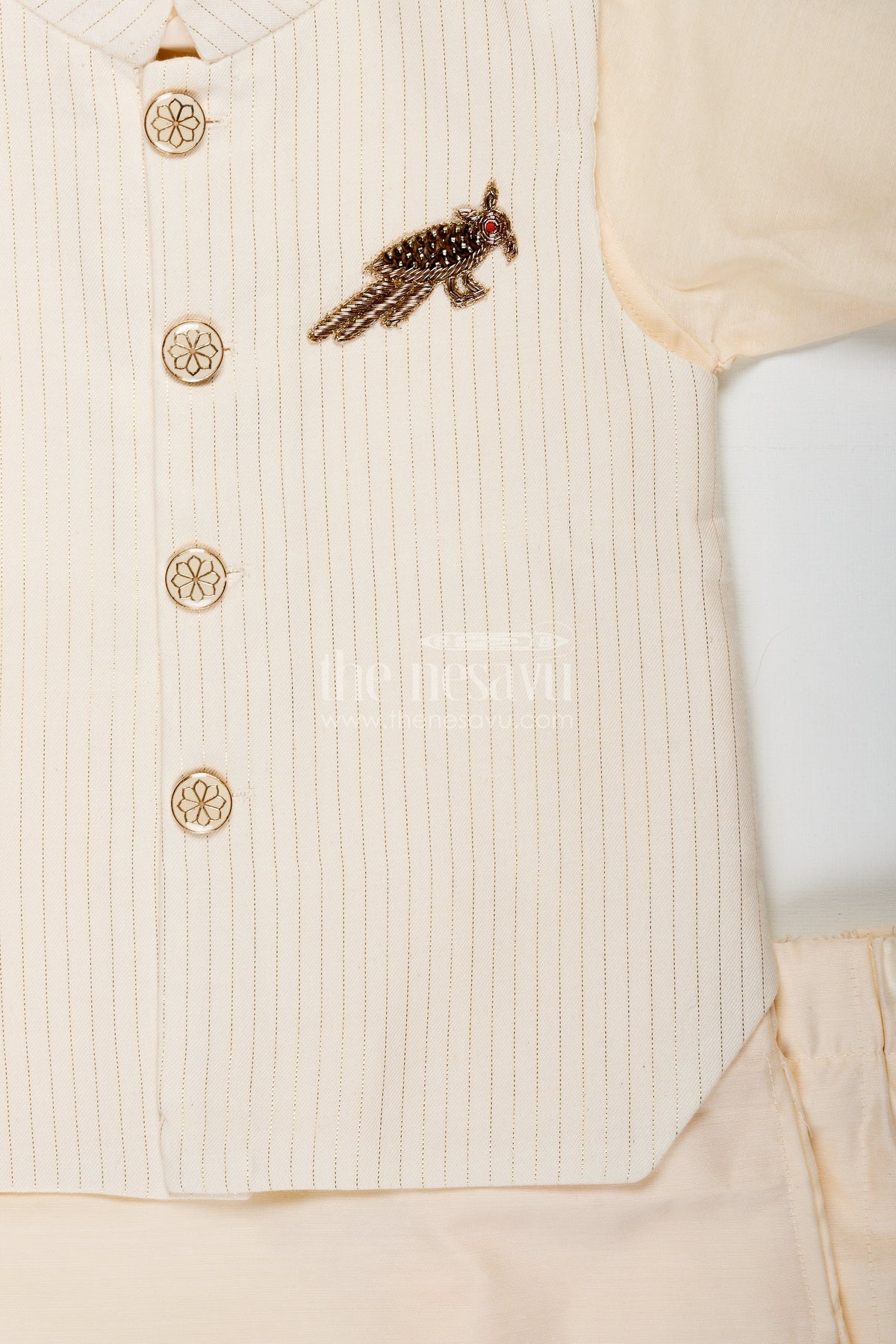 The Nesavu Boys Kurtha Set Ivory Kurta Set for Boys in Silk Blend with Designer Brooch Embellishment and Straight-Cut Pants Nesavu Ivory Kurta Set for Boys in Silk Blend with Brooch Embellishment and Stylish Jacket Design | The Nesavu