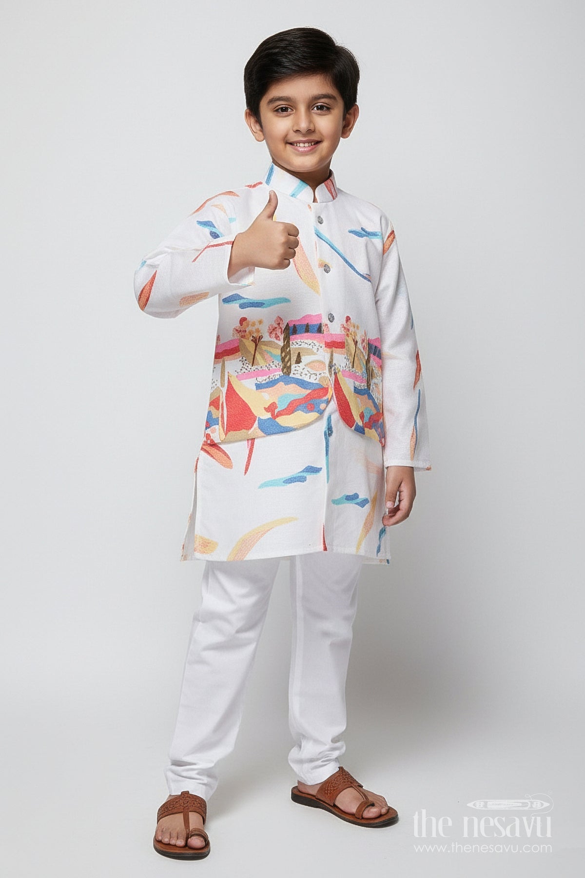 The Nesavu Boys Kurtha Set Boys Kurta Set with Digital Print Jacket for Festive Occasions Nesavu 16 (1Y) / Half white BES841A-16 Nesavu boys cotton kurta set colorful digital print jacket school festive wear