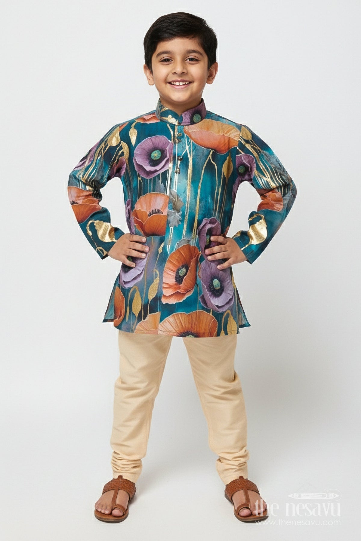 - This boys kurta set with foil print is a vibrant pick for ethnic day, weddings, and school functions