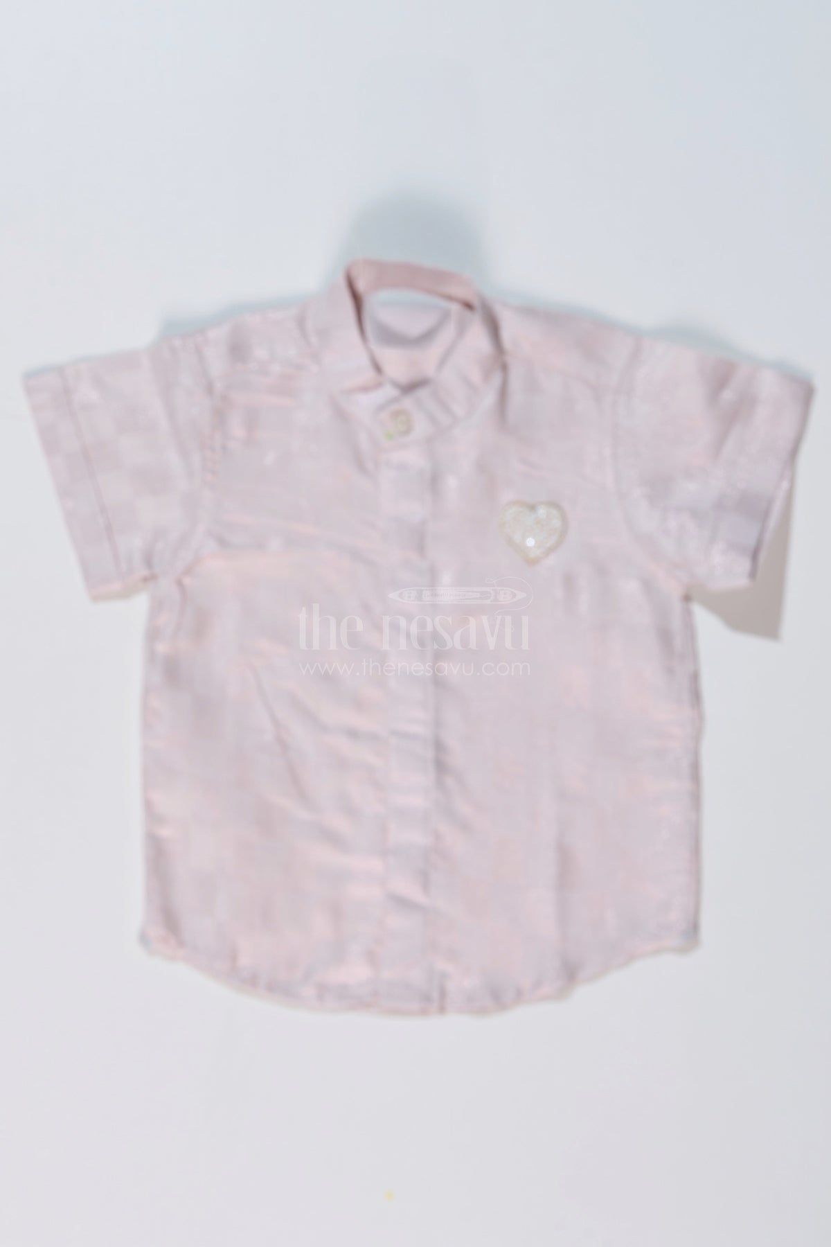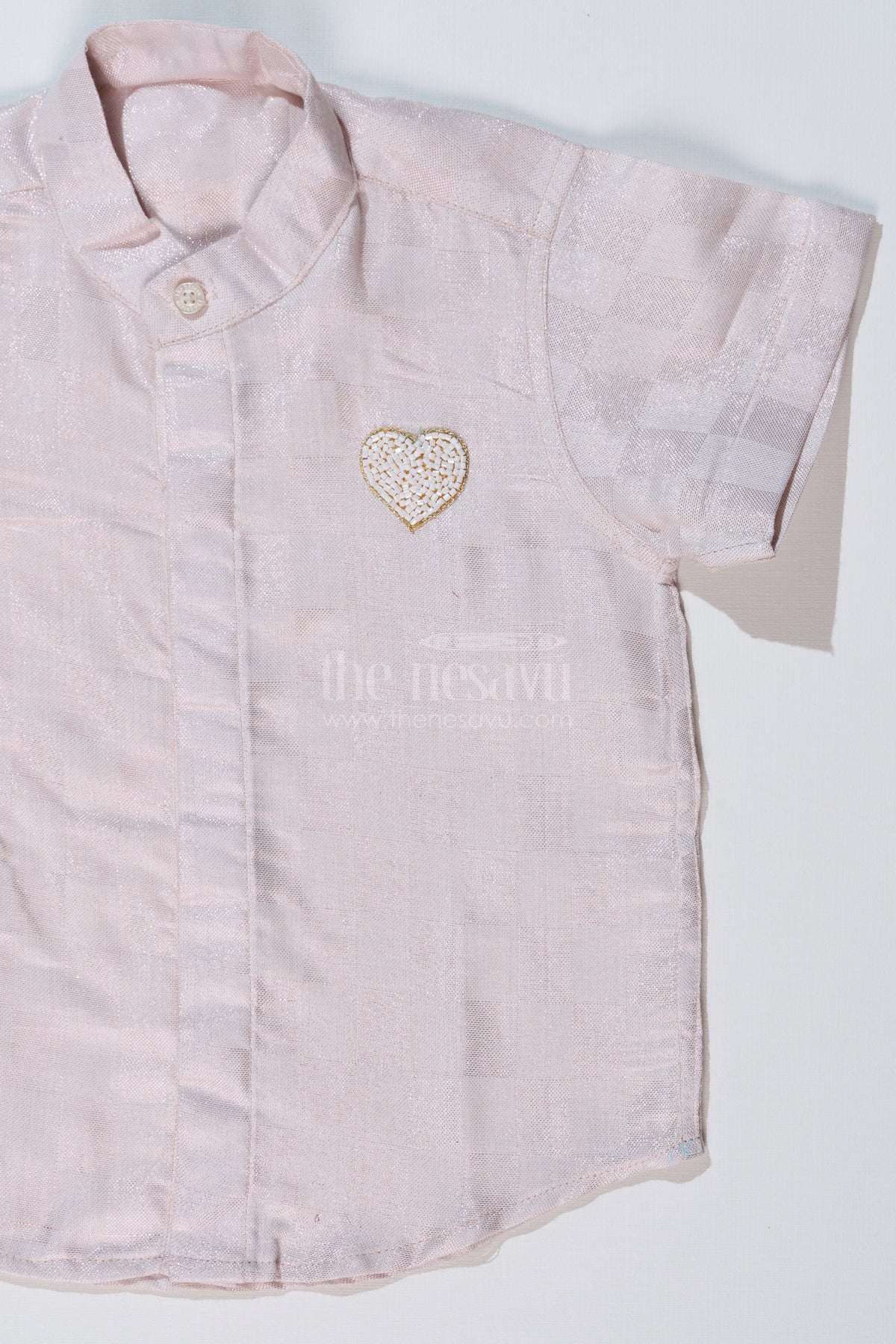 This stylish boys cotton and silk shirt is designed for elegance and comfort, making it a perfect choice for festive occasions and family gatherings. Made from cotton tissue fabric, the shirt features a soft gold hue with a sophisticated checkered pattern that enhances its traditional charm. The standout feature is the delicately embellished heart motif, adding a touch of uniqueness and style. Designed with a mandarin collar and short sleeves, this shirt ensures all-day comfort while maintaining a refined look. Lightweight and breathable, it pairs effortlessly with ethnic dhotis or modern trousers, making it a must-have for traditional celebrations.