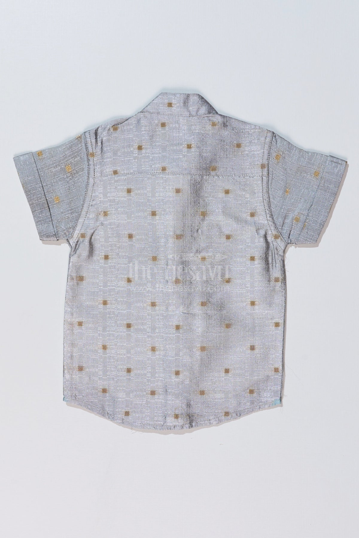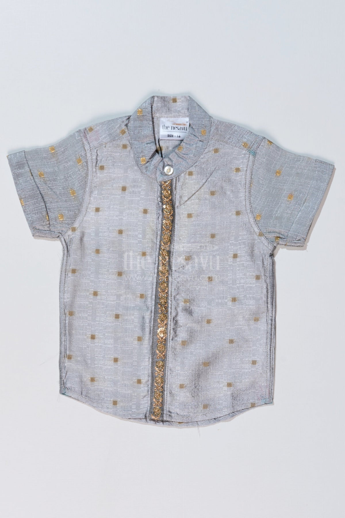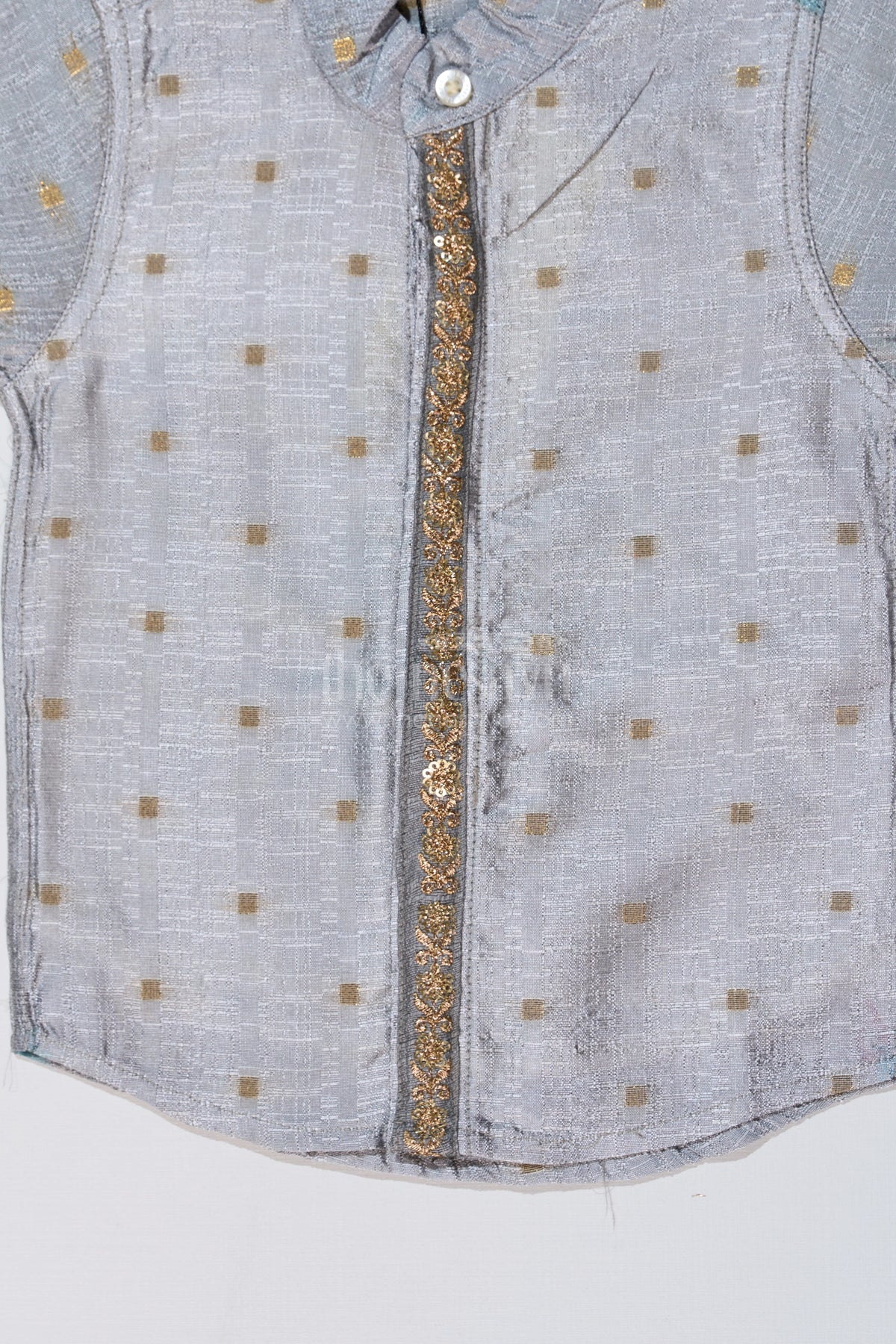 This boys gray silk shirt is a timeless and elegant choice for special occasions. The blend silk fabric provides a soft and breathable feel while maintaining a refined sheen. Featuring a beautifully embroidered front panel, this shirt adds a touch of traditional charm, making it ideal for cultural events, weddings, and temple visits. The subtle gold detailing enhances its luxurious appeal, while the mandarin collar and short sleeves ensure a comfortable and polished fit. This versatile gray silk shirt pairs well with dhotis or trousers for an effortlessly stylish ethnic look.