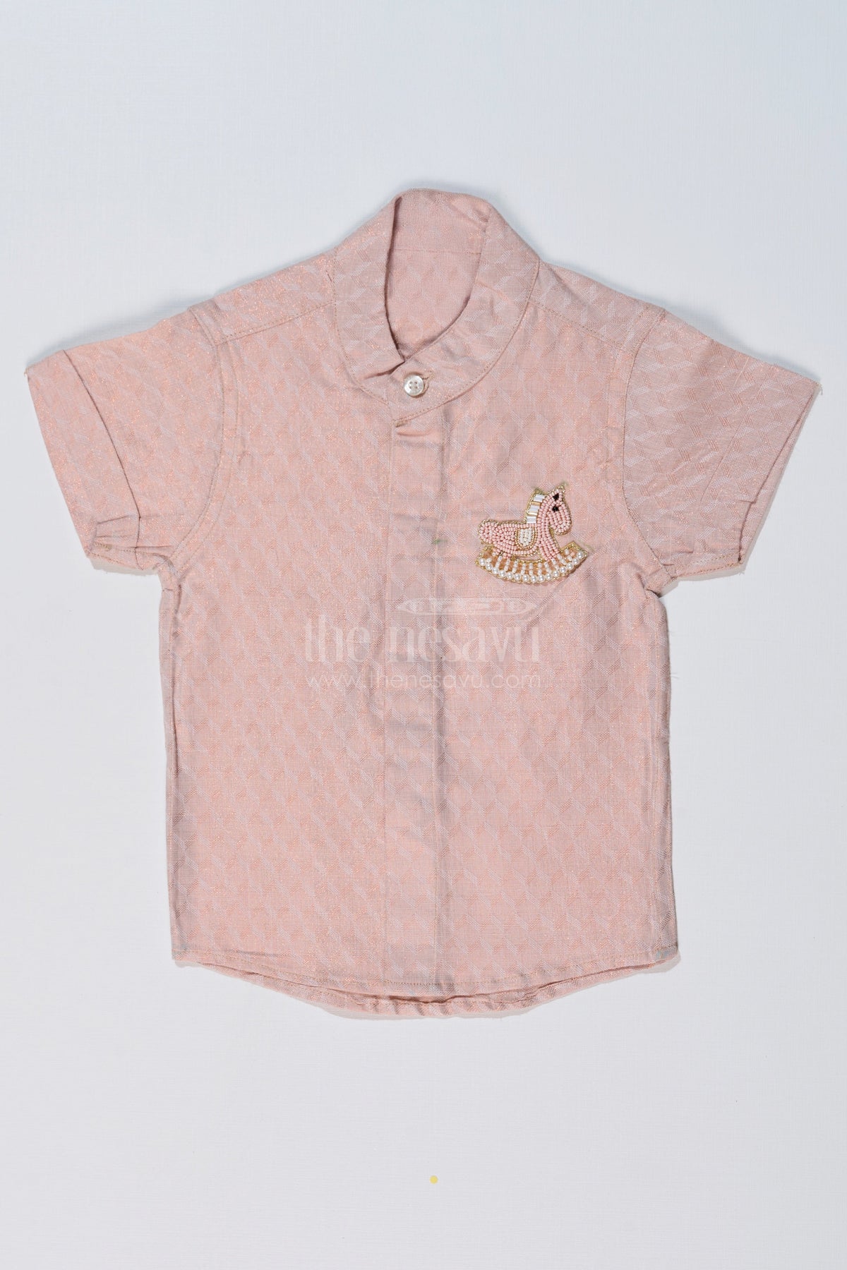 This elegant luxury silk shirt is designed for boys who love style with comfort. Made from a cotton blend with tissue, it offers a soft texture with a refined sheen, making it an excellent choice for traditional and festive occasions. The standout feature is the intricate rocking horse embroidery on the chest, adding a playful yet sophisticated touch. The Mandarin collar and short sleeves enhance its regal look, while the concealed button placket ensures a sleek finish. Whether paired with dhotis or trousers, this shirt ensures a comfortable yet fashionable fit, making your little one stand out in every celebration.