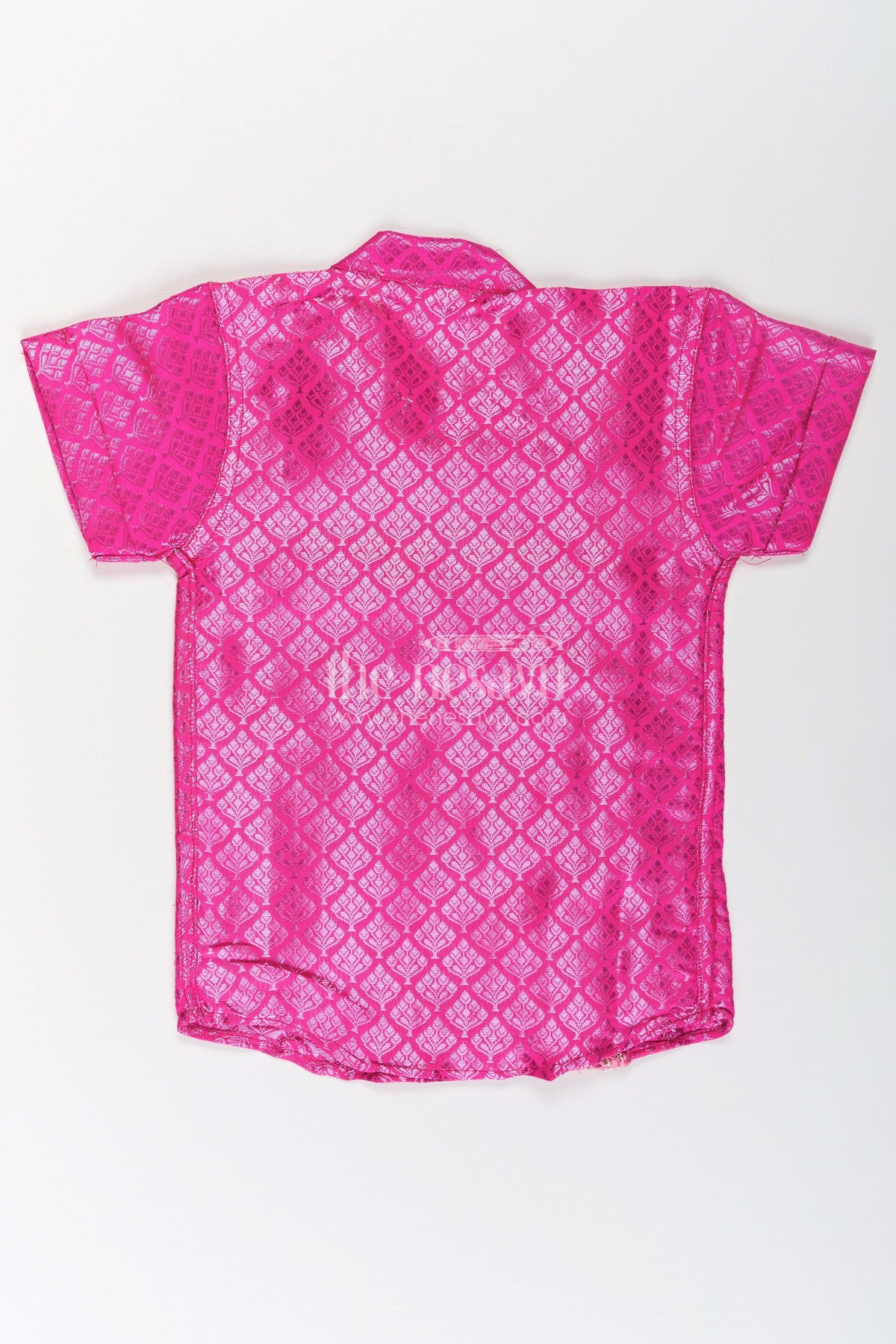 Let your little one shine in this vibrant pink silk shirt crafted from semi banaras designer fabric by Nesavu. The shirt features a rich magenta tone enhanced with intricate woven patterns, offering a luxurious texture and festive flair. A beautifully crafted pink zari-embroidered trim runs vertically down the front, lending an elegant touch. With a mandarin collar, breathable design, and comfortable fit, this shirt is ideal for ethnic gatherings or traditional celebrations. The semi banaras fabric ensures a soft feel and subtle sheen, perfect for stylish boys who want to look polished while staying at ease all day long.