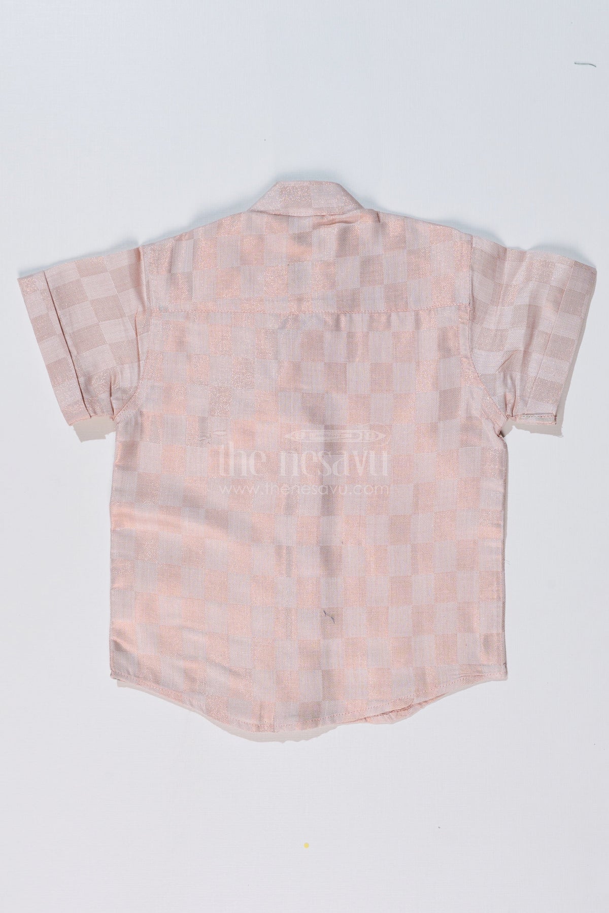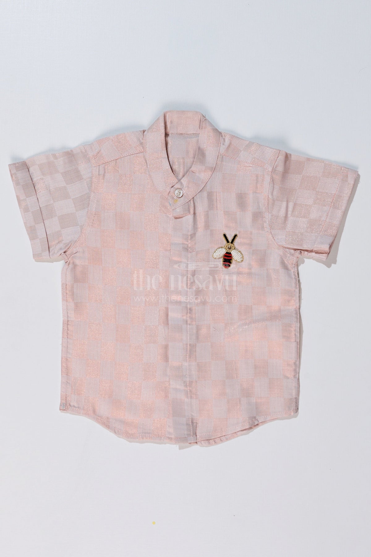 This boys silk and cotton shirt blends traditional charm with modern style. Designed in a rich gold cotton tissue fabric, it features a subtle checkered pattern that gives it a refined look. The highlight of this shirt is the intricately hand-embellished bee motif, adding a unique and artistic touch. Featuring a mandarin collar and short sleeves, this shirt ensures both elegance and ease of movement, making it an ideal pick for festive occasions, family gatherings, or cultural events. Pair it with a dhoti for a traditional ensemble or trousers for a stylish Indo-Western look.