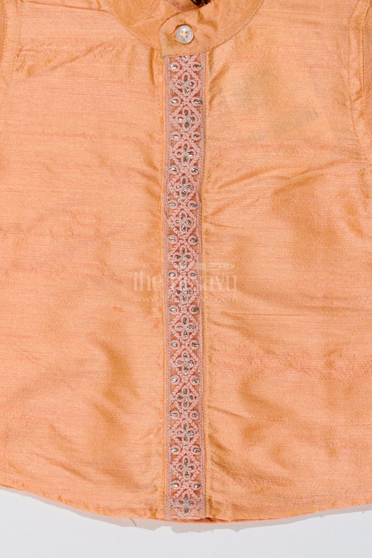 These boys trendy half sleeve shirts are a perfect blend of modern style and traditional elegance. Crafted from premium blend silk, the fabric offers a soft touch with a subtle sheen, making it an excellent choice for festive and cultural occasions. Featuring intricate embroidery along the button panel and sleeve cuffs, this shirt exudes a regal charm while maintaining a comfortable fit for kids. The mandarin collar enhances its sophisticated appeal, and the half-sleeve design ensures ease of movement. Whether paired with a dhoti for a traditional look or trousers for a semi-formal outfit, this silk shirt is a stylish addition to any boy's wardrobe.