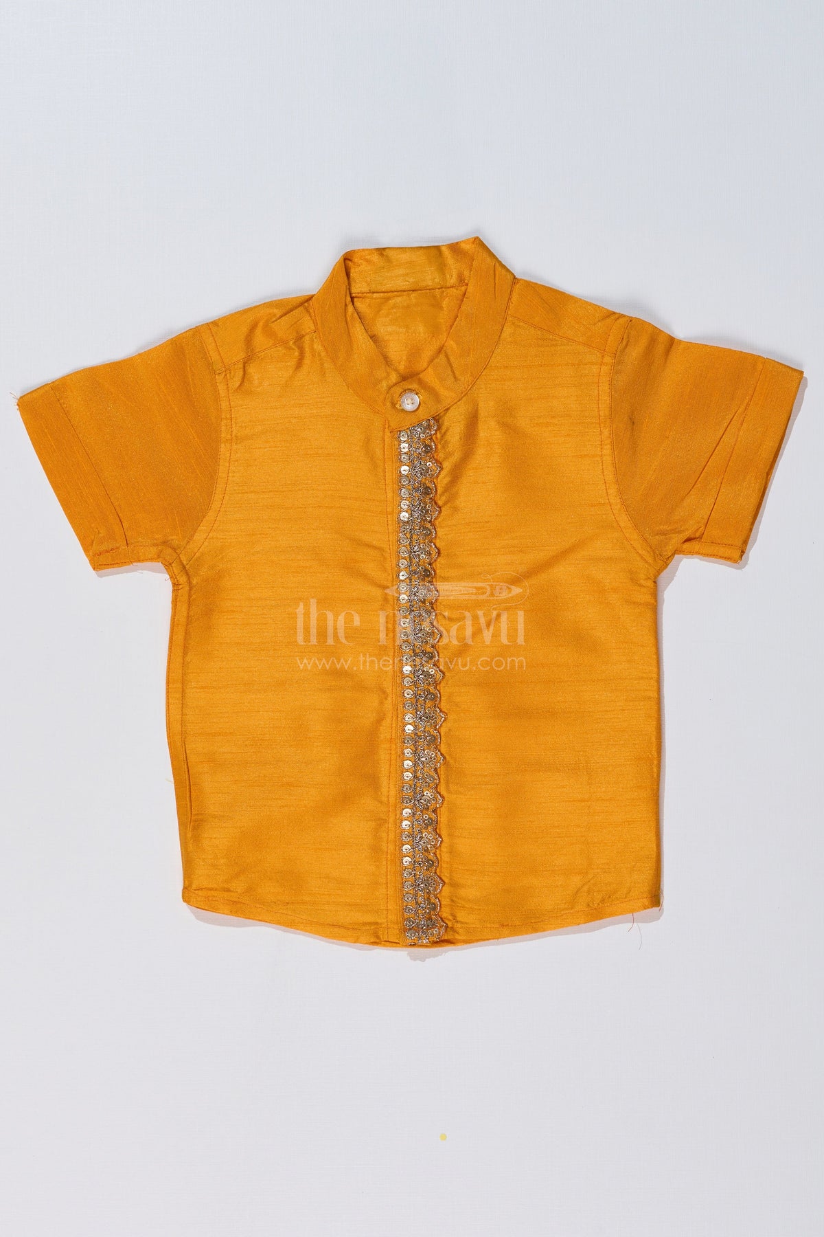 This boys yellow half shirt is a vibrant and stylish choice for festive occasions and cultural gatherings. Made from a premium silk blend fabric, it offers a soft texture with a luxurious sheen that enhances its rich appearance. The intricate embroidery along the button panel adds a regal touch, making it perfect for weddings, temple visits, and family celebrations. Designed with short sleeves and a mandarin collar, this shirt ensures a sophisticated look while providing comfort. Pair it with a dhoti or trousers for a charming traditional ensemble.