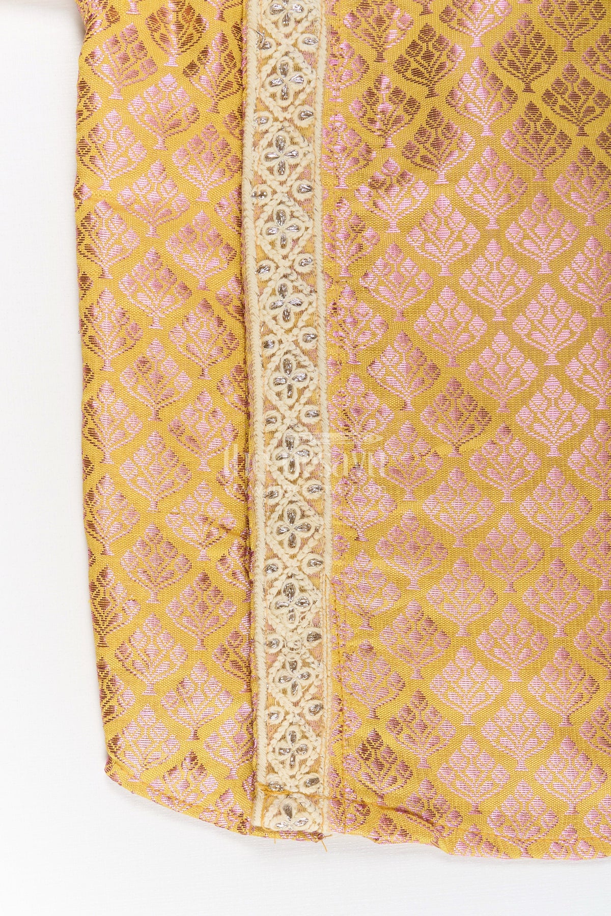 Bring a bold burst of tradition to your child’s look with this vibrant yellow silk shirt by Nesavu. Made from semi banaras designer silk, the shirt features a rich golden-yellow hue interwoven with shimmering motifs that reflect light beautifully. A side panel of embroidered zari adds an elegant frame to the design, turning this shirt into a celebration of texture and color. With a smooth, breathable feel and soft lining, it's crafted to ensure your little one stays comfortable through every event. The traditional mandarin collar and side button closure make dressing quick and fuss-free. Perfect for festive wear, this shirt pairs effortlessly with both modern and traditional bottoms.