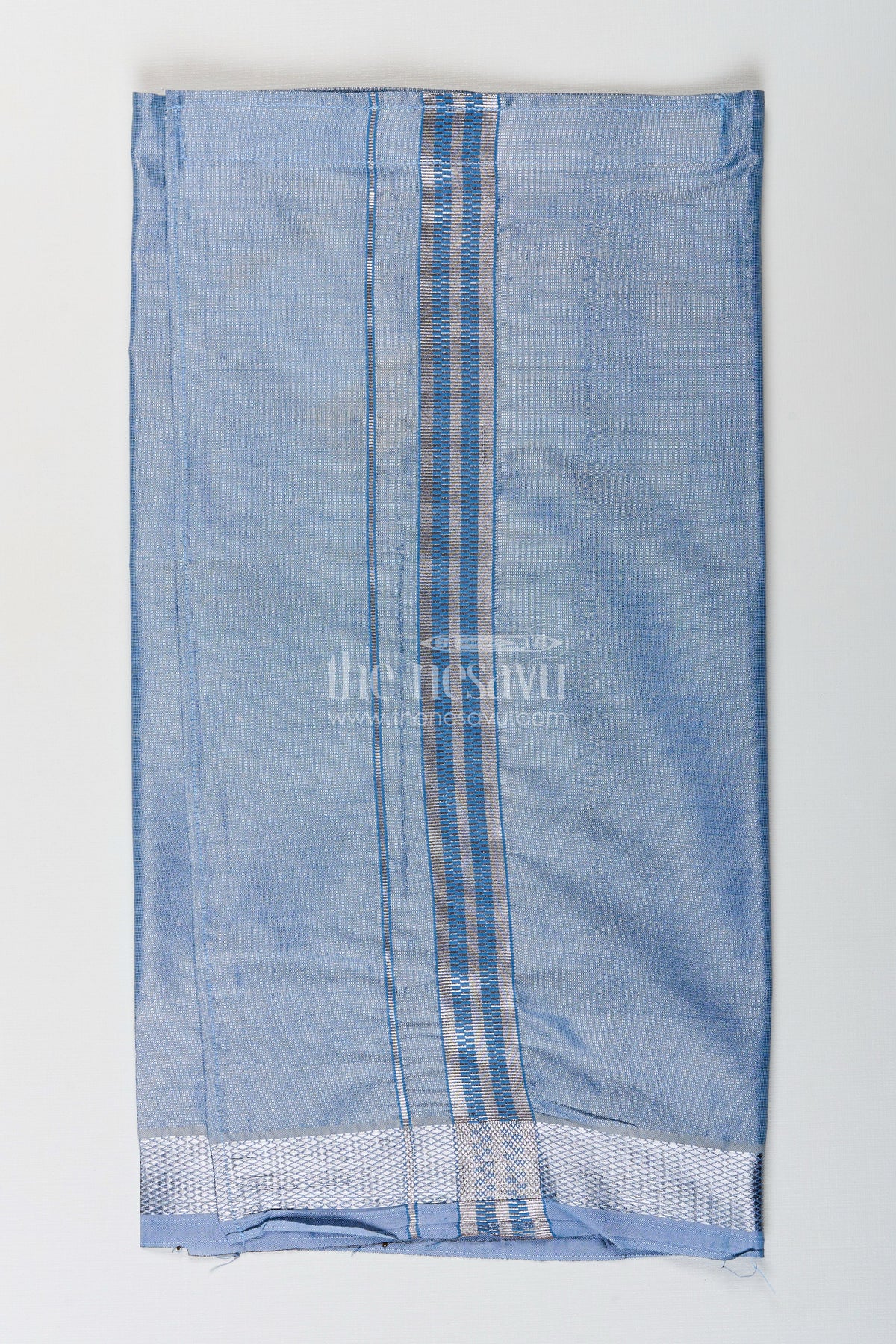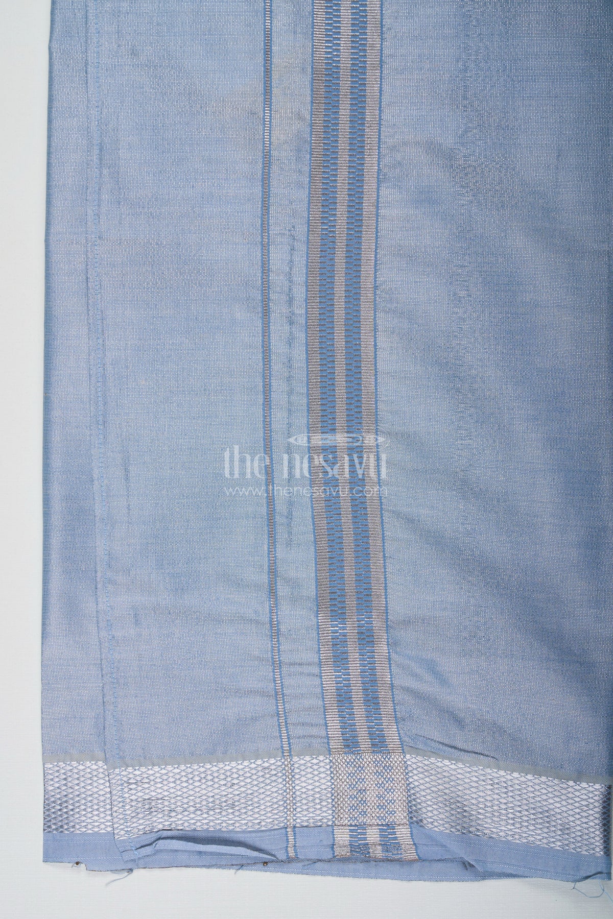 Highlight your child's festive wardrobe with this trendy dhoti fashion piece from Nesavu. Crafted from smooth grey tissue fabric, this dhoti exudes sophistication with a stylish silver zari border running neatly along the length. It’s an ideal fusion of tradition and contemporary aesthetics, made for modern-day celebrations and cultural moments. The fabric’s soft texture and airy finish keep young boys comfortable while giving them a polished look that’s easy to pair with traditional kurtas or shirts.
