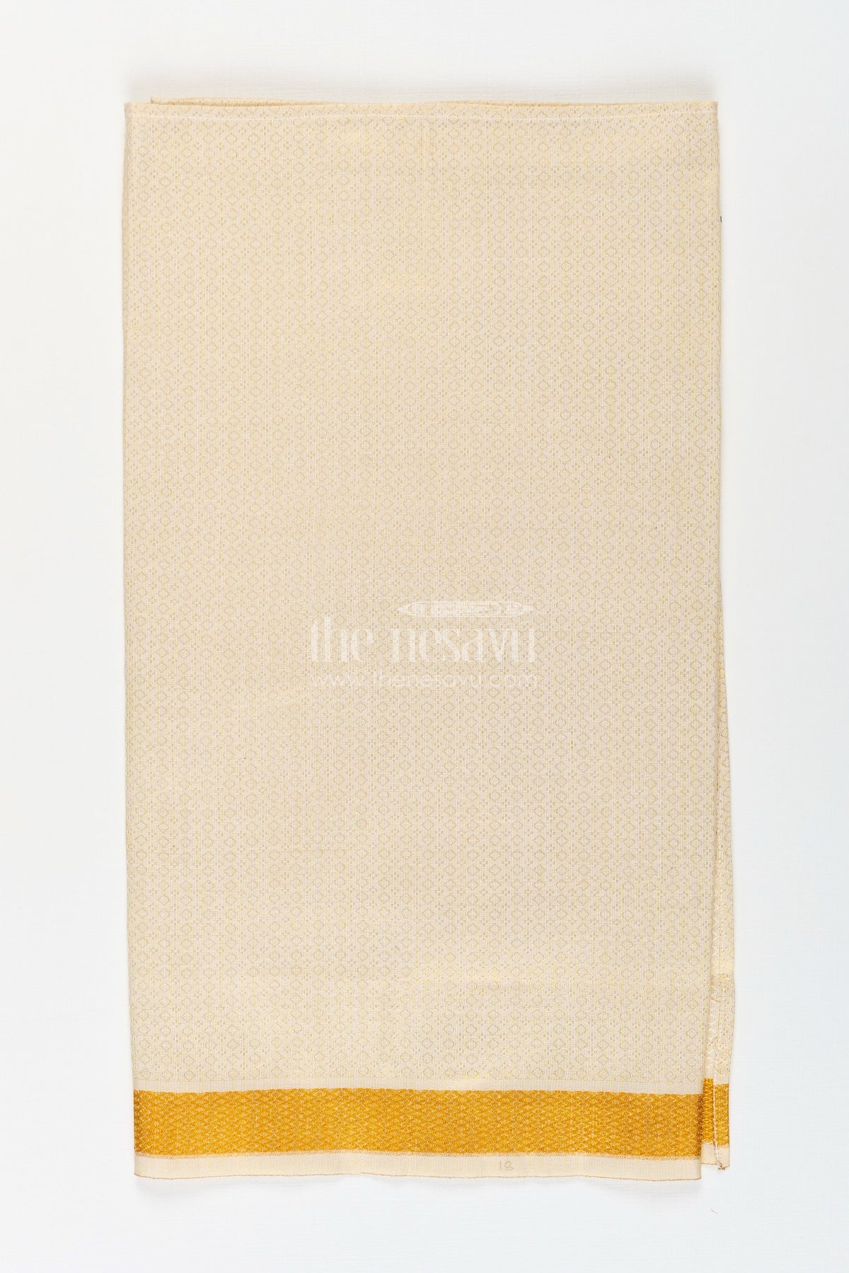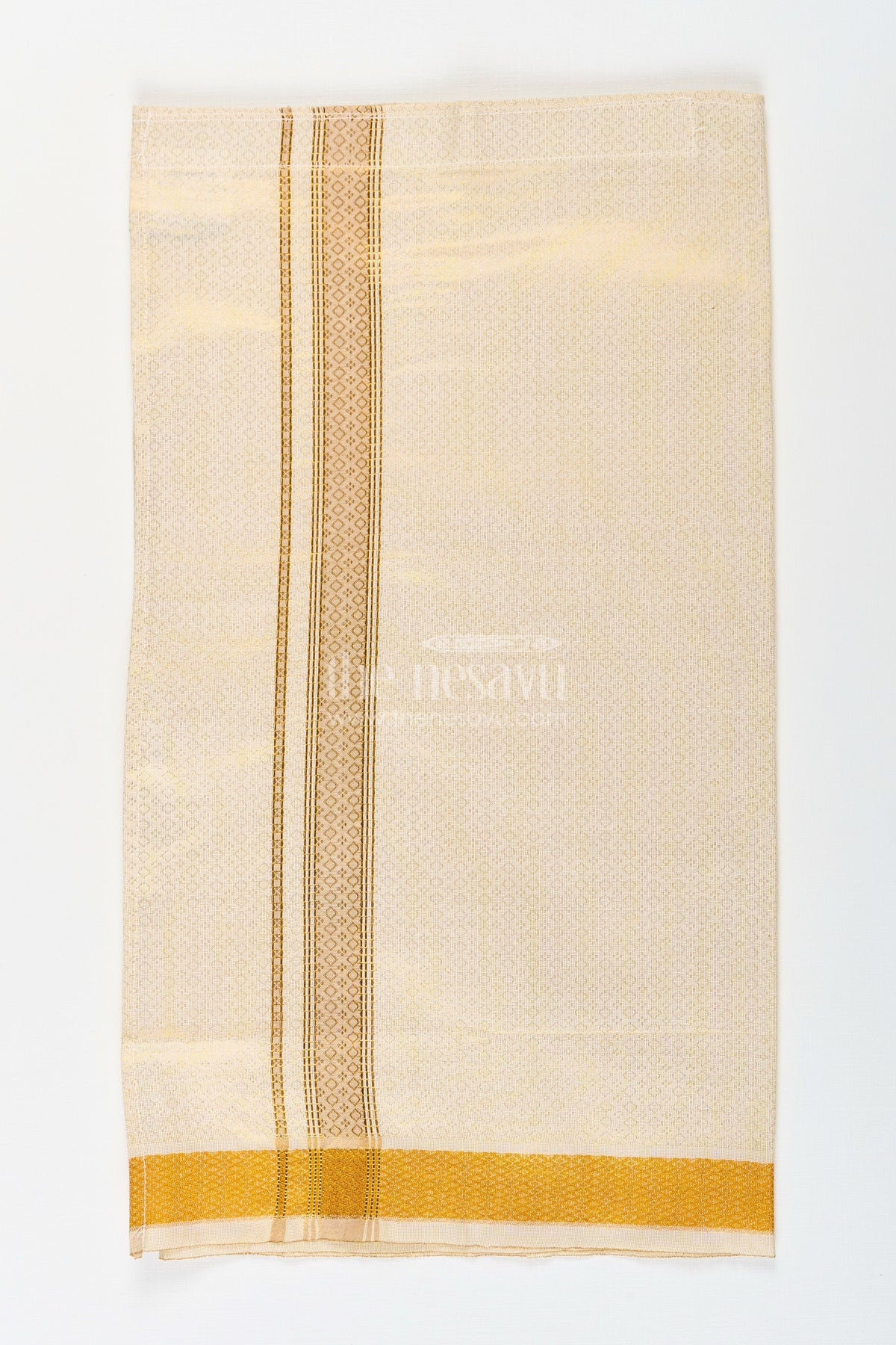 Achieve a timeless dhoti look for your child with this elegant Nesavu boys dhoti set. Made from soft tissue fabric with embossed detailing, this dhoti features a subtle golden tone enriched with intricate zari work and a classic broad border. The embossed pattern lends depth and sophistication, making it ideal for special occasions, temple visits, or cultural events. Lightweight and breathable, the fabric ensures comfort while the traditional layout provides an authentic ethnic appearance for your young one.