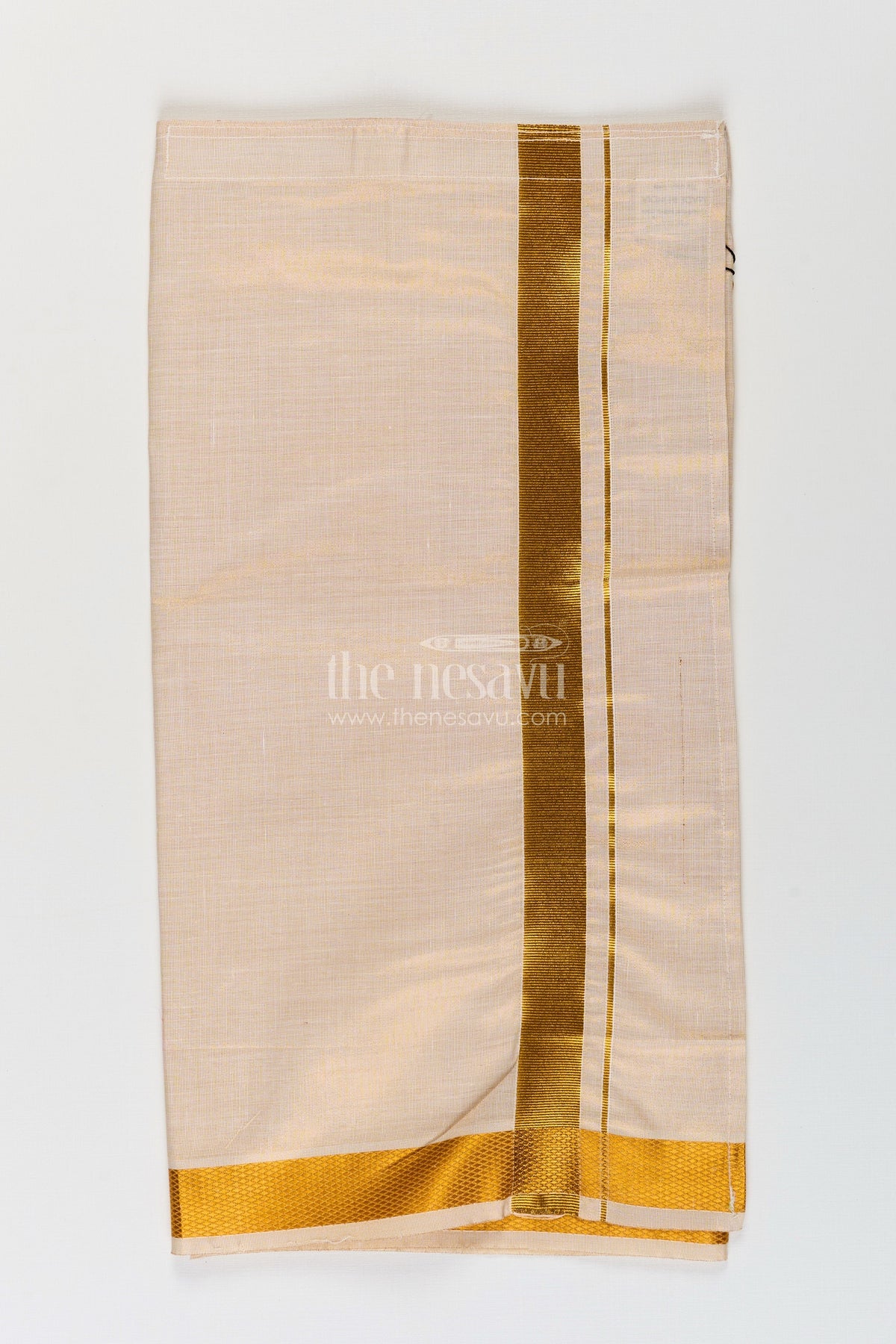 This fashion dhoti from Nesavu offers the perfect combination of tradition and contemporary design. Made in ivory tissue fabric, it features a bold golden zari border and sleek finish that enhances its festive appeal. Whether it’s worn for weddings, festivals, or photo sessions, the dhoti provides comfort, elegance, and statement style. Its sheen and soft drape make it suitable for boys who want to dress with flair while maintaining a culturally rich outfit.