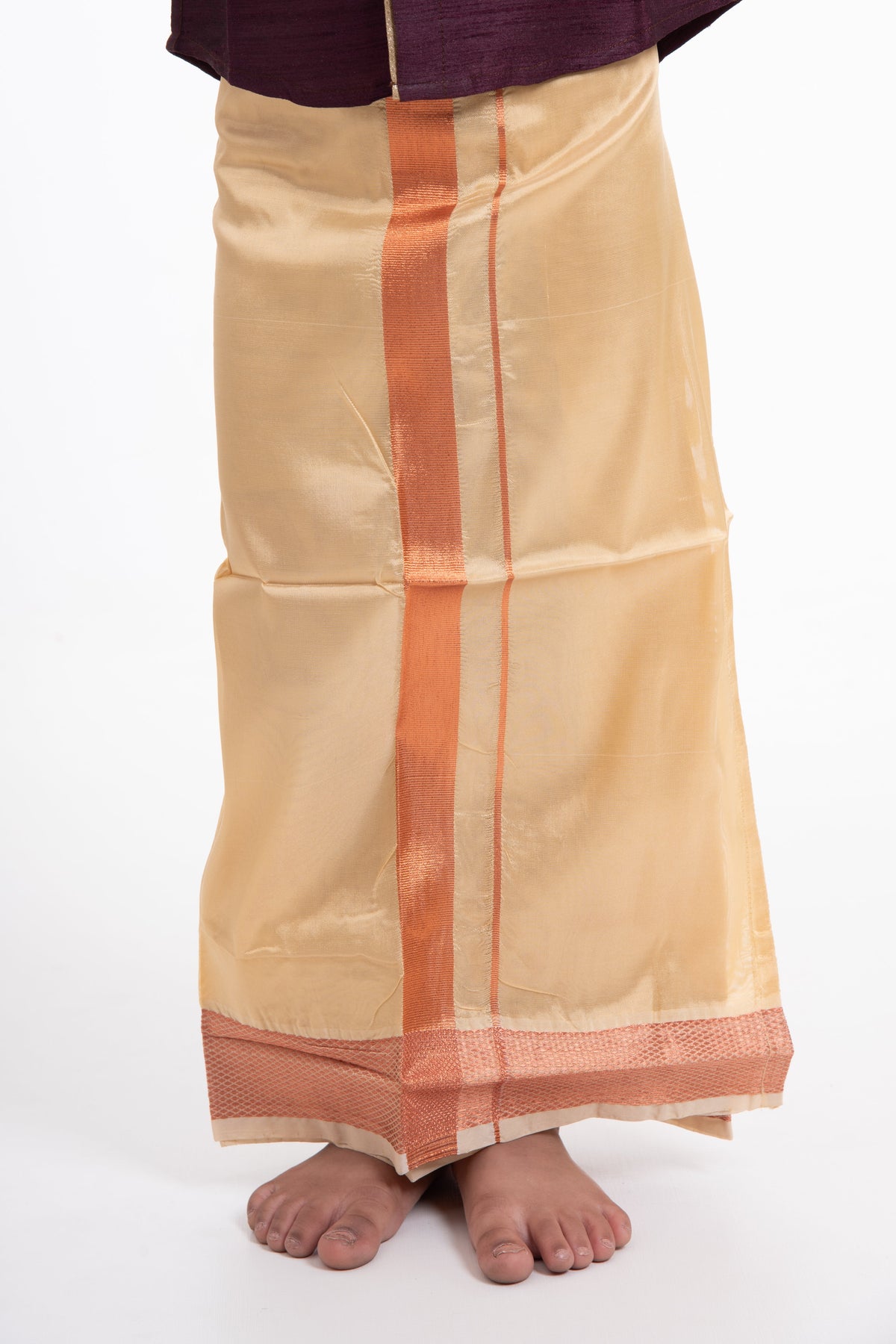 Presenting the "Golden Yellow Silk Blend Boys Dhoti," a traditional ensemble reimagined for today's youthful vibrancy. This exquisite dhoti radiates an elegant charm with its rich golden yellow hue complemented by intricate traditional borders in a contrasting deep maroon. Crafted from a luxurious silk blend, this dhoti ensures a comfortable fit and graceful flow, making it ideal for weddings, festivals, and ceremonial occasions. The detailed woven patterns along the borders add a distinctive touch of craftsmanship, perfect for enhancing any festive wardrobe.