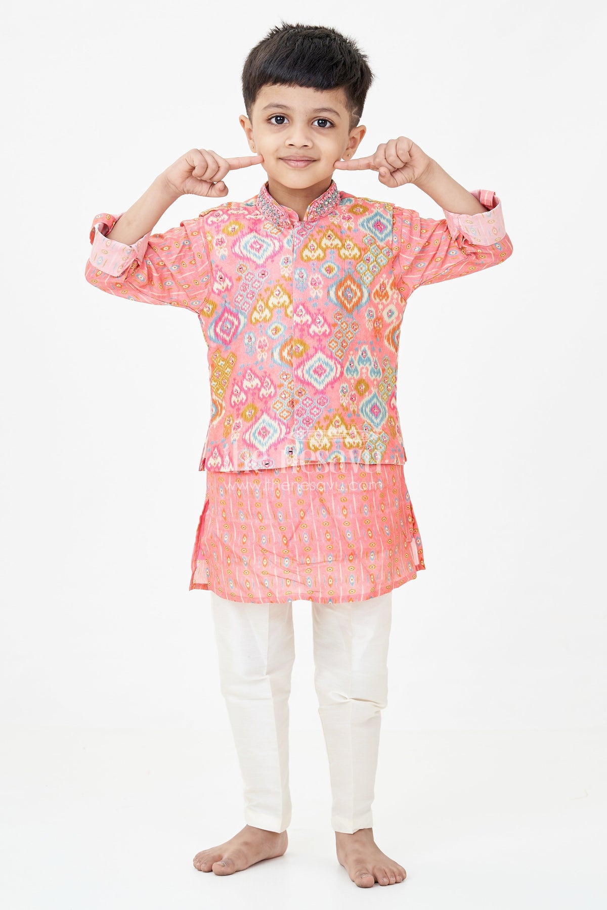 Jacket pants set crafted for special moments, this boys ensemble includes a digitally printed coral kurta with geometric detailing and a vibrant Nehru jacket in bold ethnic tones. The vest features vivid traditional motifs with mirror-style accents, enhancing the festive charm. Cream trousers complete the outfit, providing a clean, classic contrast. The Viscose blend material makes this set comfortable and breathable, perfect for long hours of wear during functions or family events. Its bright colors and modern ethnic styling make it a standout choice in any celebration wardrobe.