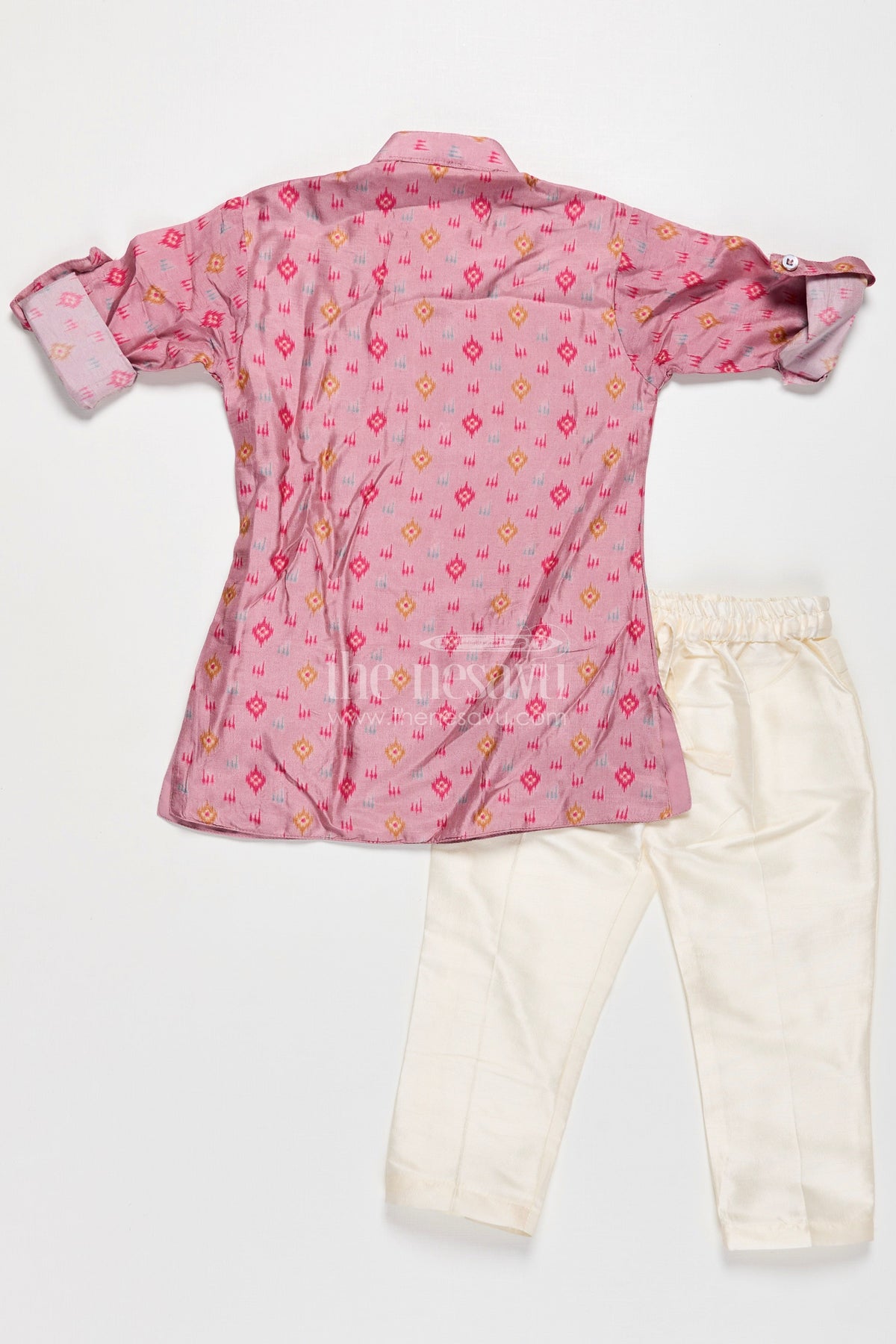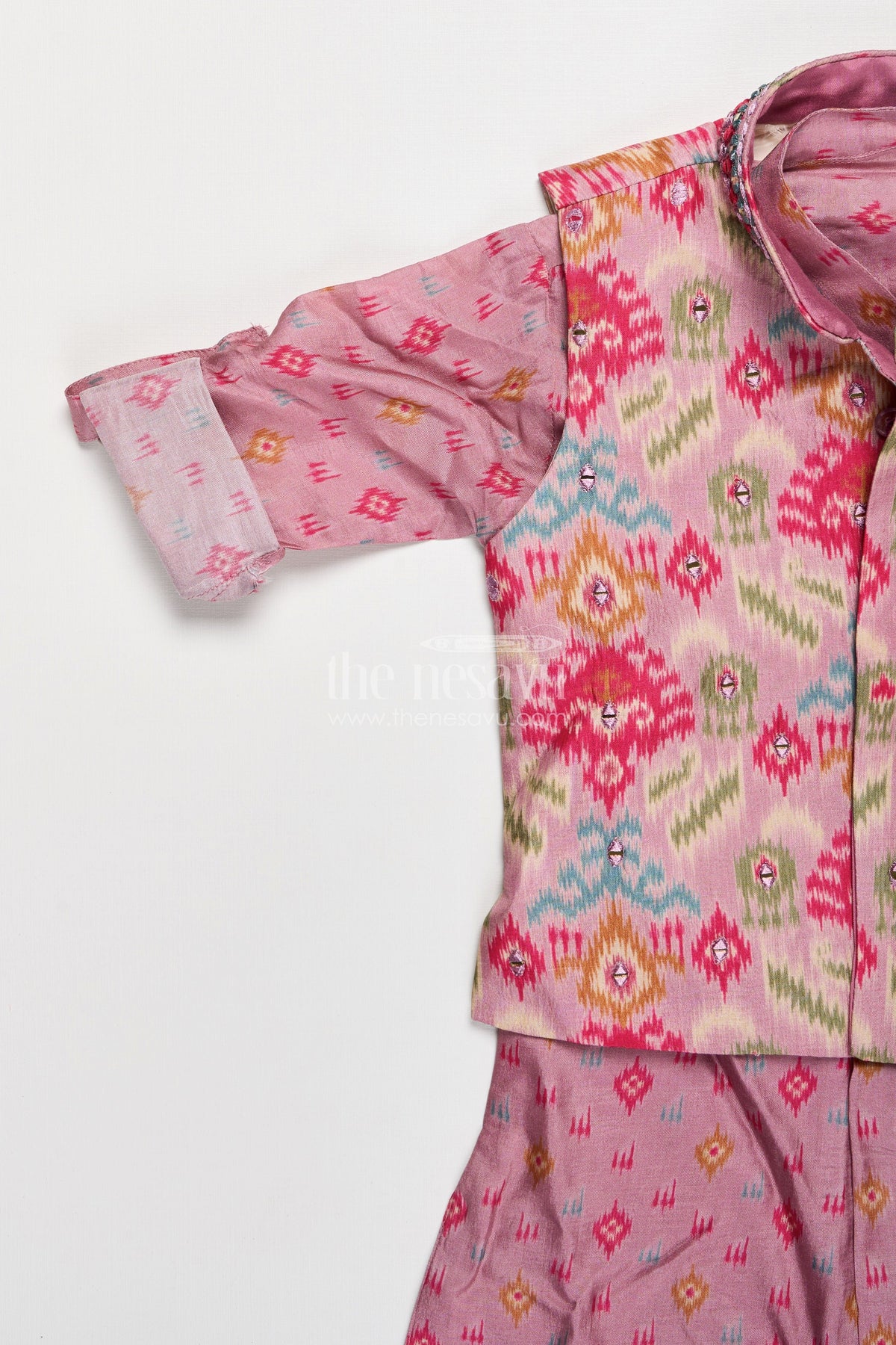 Jacket and pants set gets a stylish ethnic twist with this beautifully coordinated boys ensemble. Crafted from a breathable Viscose blend with digital print, the set includes a pastel pink long-sleeve kurta with a subtle Ikat-style pattern and a sleeveless Nehru jacket in a vibrant multicolor weave. Paired with cream-colored straight-cut pants, this three-piece outfit offers both style and ease for festive occasions. The mix of soft fabric and refined design ensures comfort throughout the day, making it ideal for traditional ceremonies, weddings, or cultural celebrations. The jacket's decorative buttons and the kurta's neat collar elevate the look, giving your little one a smart, composed appearance.