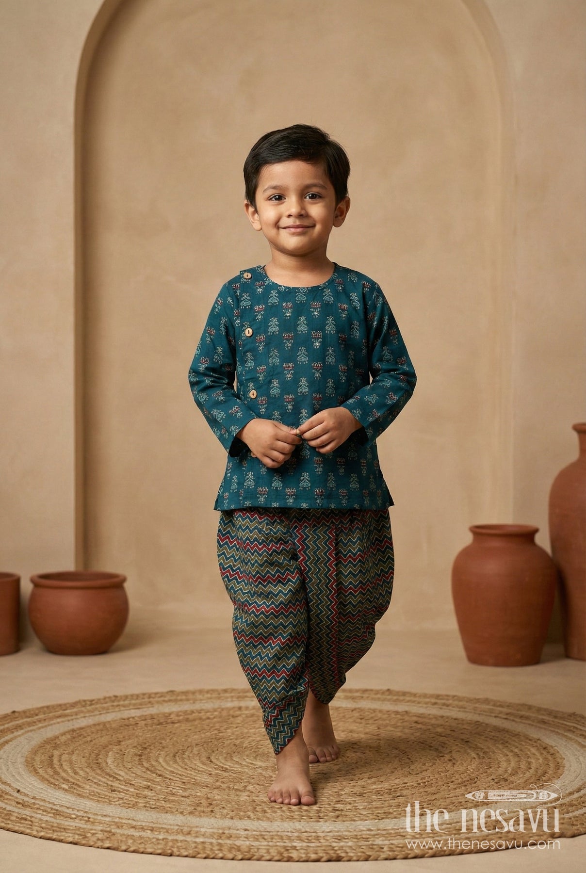Boys Designer Dhoti Kurta Set for Weddings is a striking combination of traditional style and modern flair. The dark green kurta is crafted from soft cotton and highlighted by elegant red and green ethnic motifs that make the piece truly unique. The dhoti pants feature a contemporary printed design that complements the kurta for a balanced, festive look. Whether it’s a wedding, temple visit, or grand celebration, this outfit provides a bold and graceful presence while keeping boys at ease with its breathable fabric and relaxed silhouette.