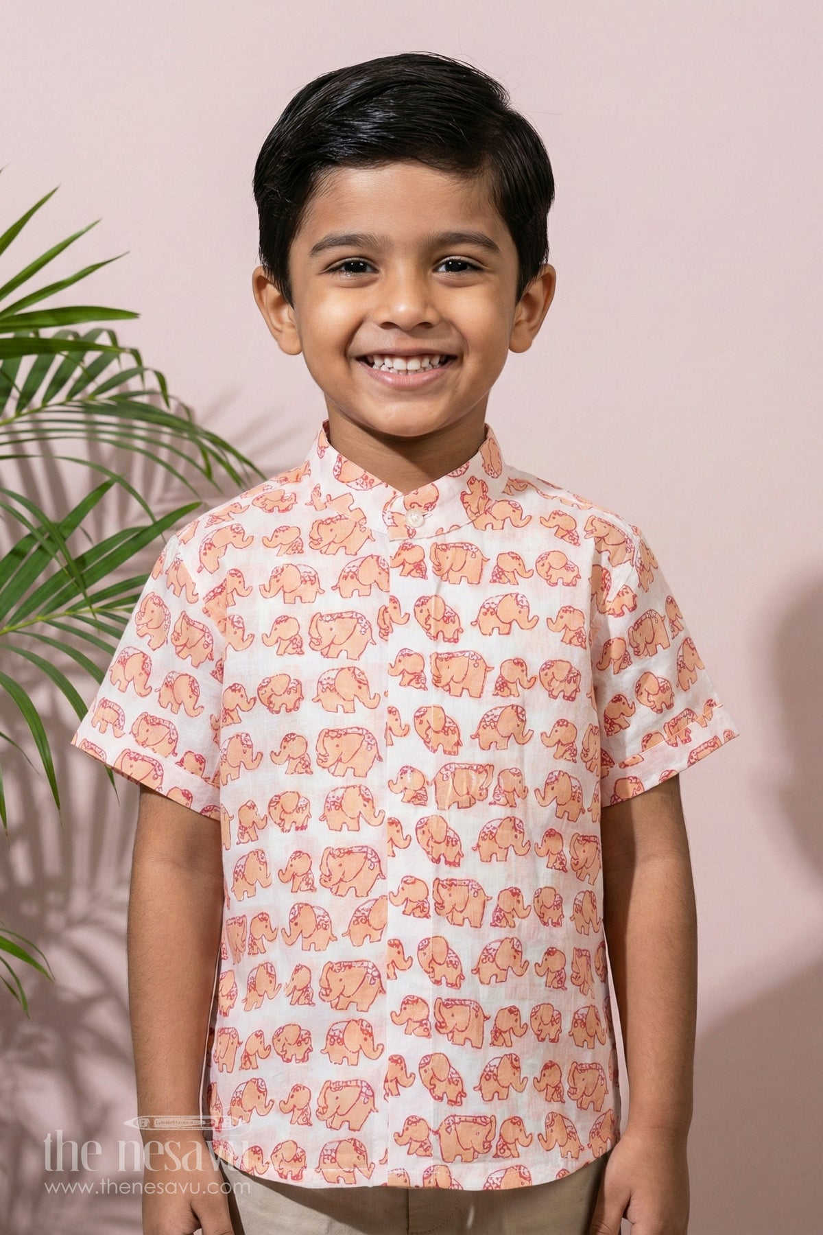This adorable orange half shirt is designed for boys who love fun and cheerful prints. Made from breathable cotton block print fabric, it features an all-over elephant motif in warm orange tones, adding a playful and vibrant touch. The half sleeves and button-down design ensure ease of movement and comfort, making it a great choice for casual outings, playdates, and summer days. Pair it with shorts or jeans for a stylish and comfortable everyday look.