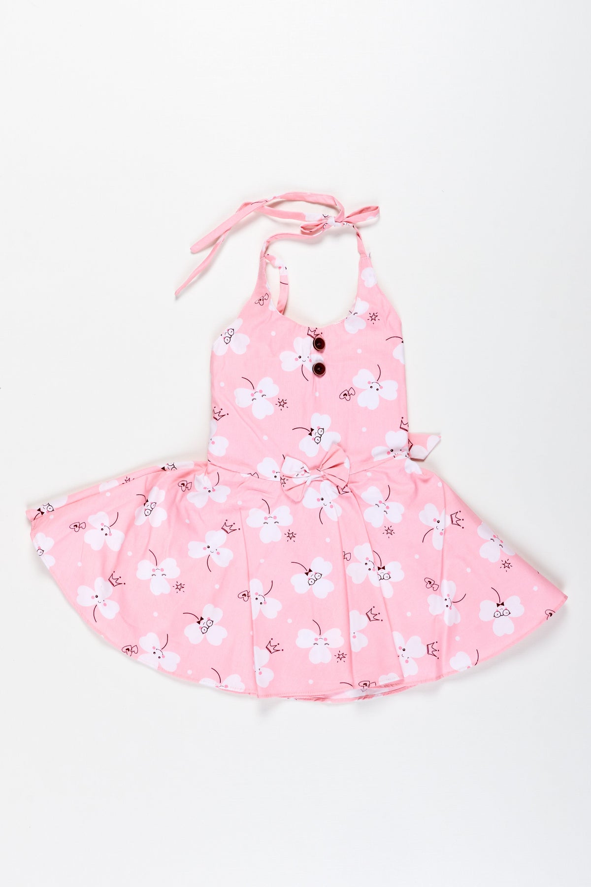 Girls Pink Cartoon Floral Frock with Bow and Pleats for Summer Outings