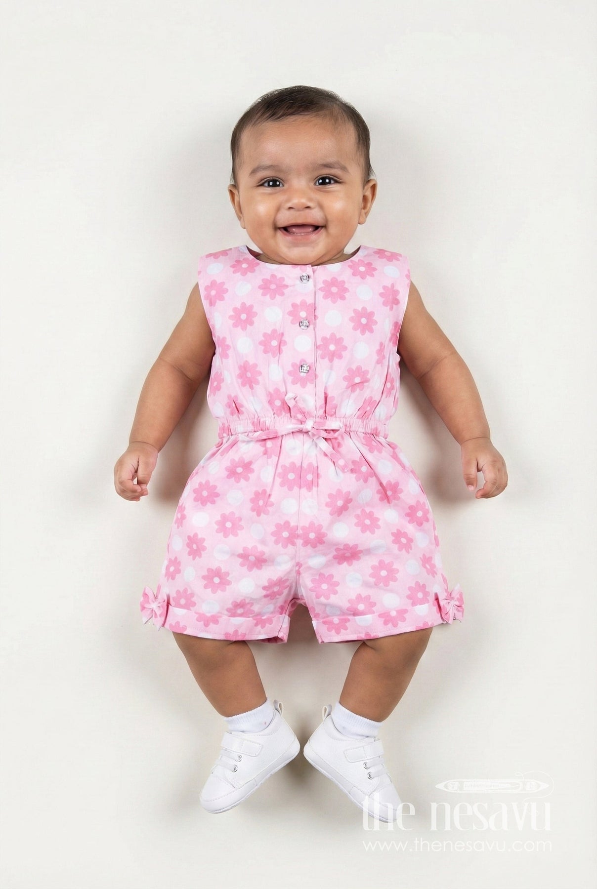 - Adorable cotton jumpsuit in pink with white daisy digital print