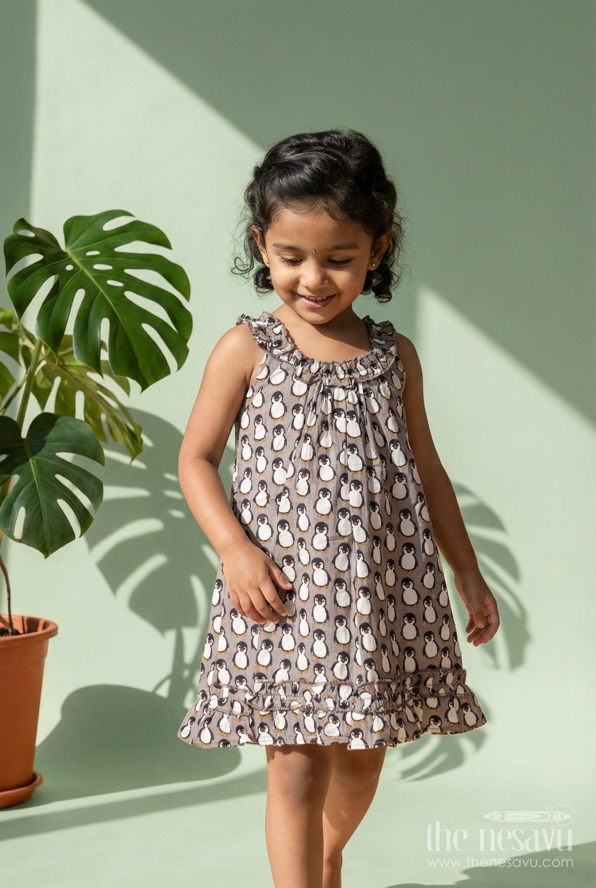 The Nesavu Girls Cotton Frock Kids Casual Cotton Printed Frock for Girls with Brown Penguin Block Print and Frilled Shoulders Nesavu Nesavu Brown Hand Block Kids Casual Cotton Printed Frock Penguin Motifs Ruffled Design