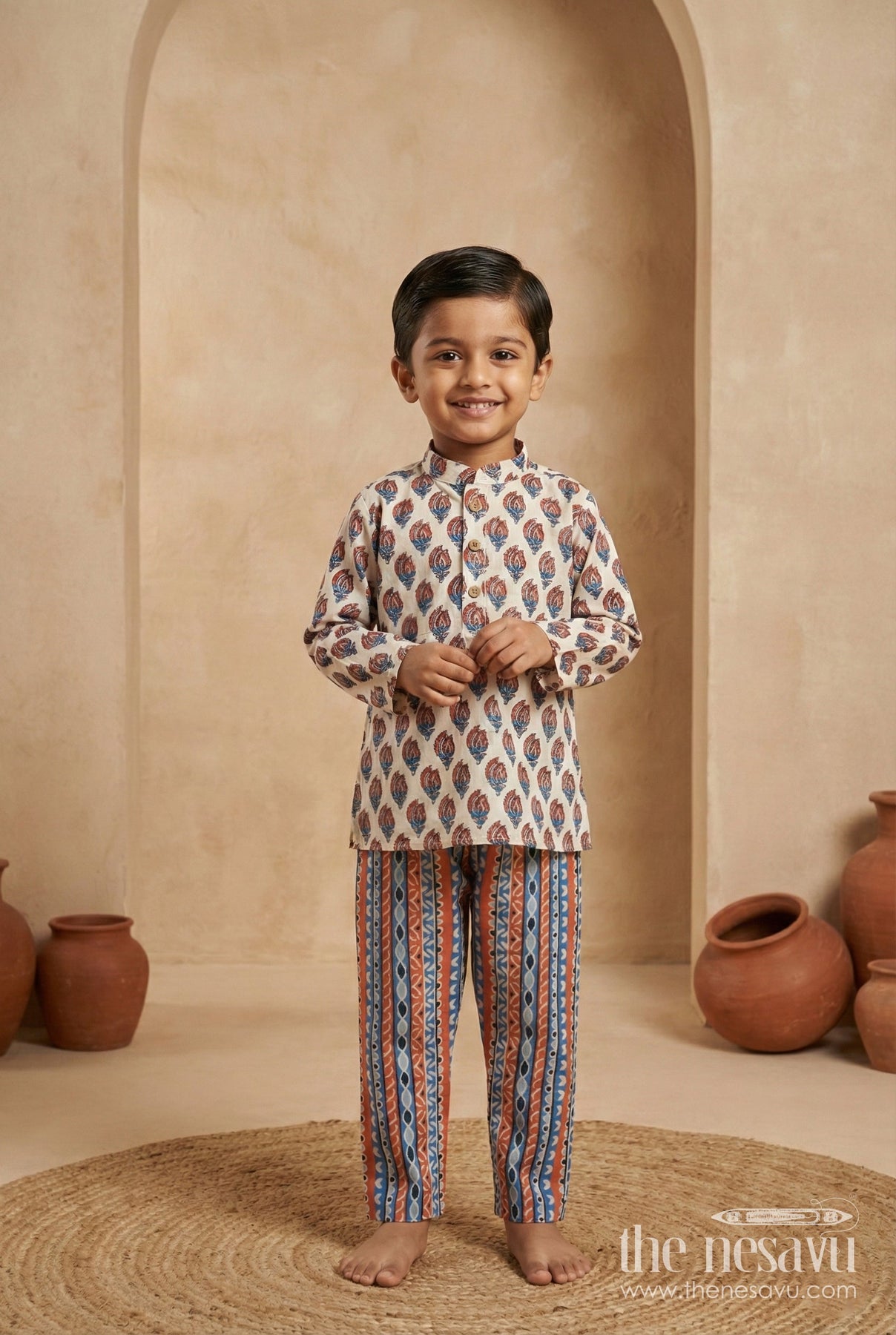 Kids Kurta Set for Festivals and Family Gatherings is a vibrant blend of comfort and culture. The cream kurta is decorated with eye-catching block-printed motifs in traditional red and blue, paired with contrast striped pants in bold ethnic patterns. Made from breathable cotton, this outfit is ideal for lively family events and festive days. The full-sleeve kurta ensures coverage while the lightweight pants offer ease of movement, making it perfect for playful occasions. The mix of classic prints and contemporary comfort makes this a delightful ethnic choice for kids.