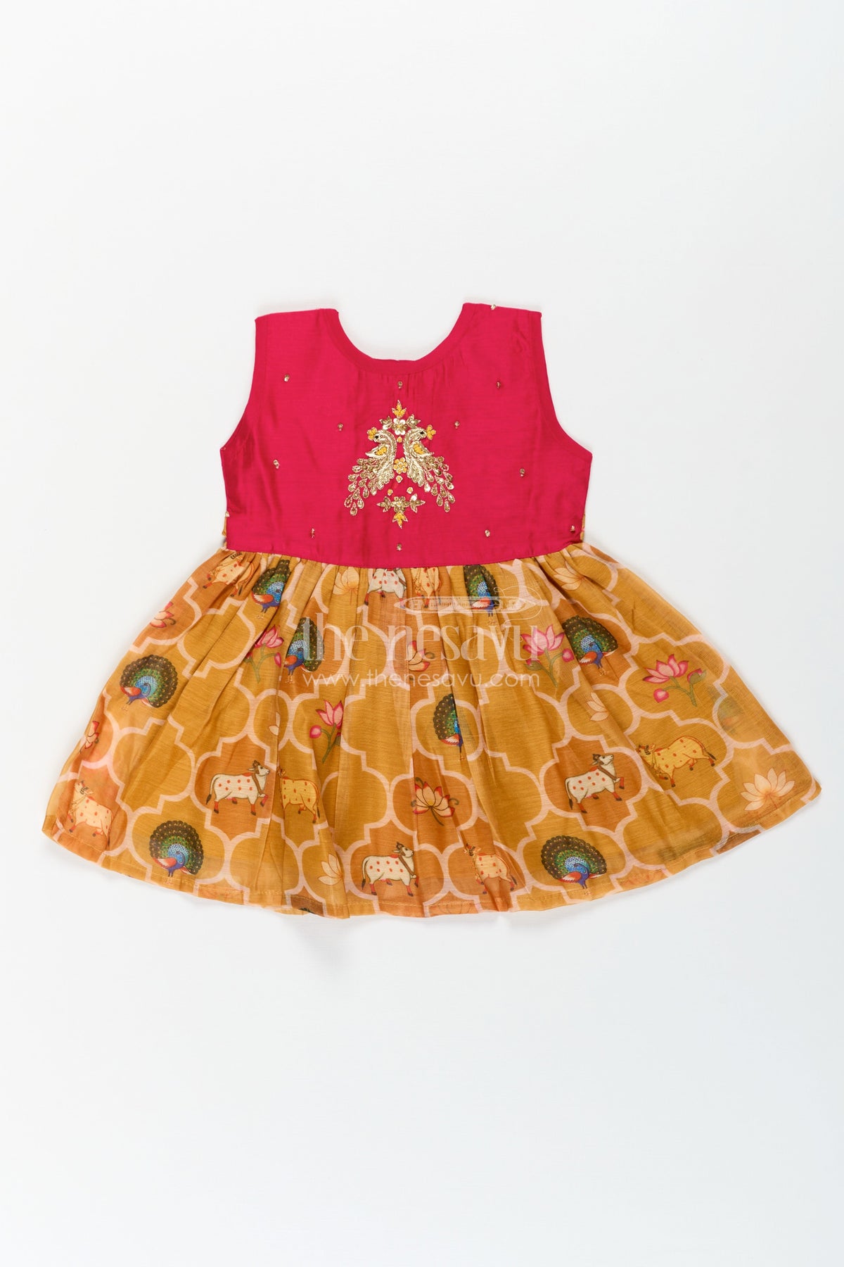 Celebrate childhood joy with this playful piece from our new designs of frocks collection. Featuring a deep maroon cotton yoke with peacock embroidery and delicate sequence embellishment, the frock is paired with a gathered mustard skirt that showcases a vibrant animal-themed digital print. Crafted with breathable fabric and soft gathers, it’s a lovely fusion of creativity and comfort—ideal for festive events and playful outings.
