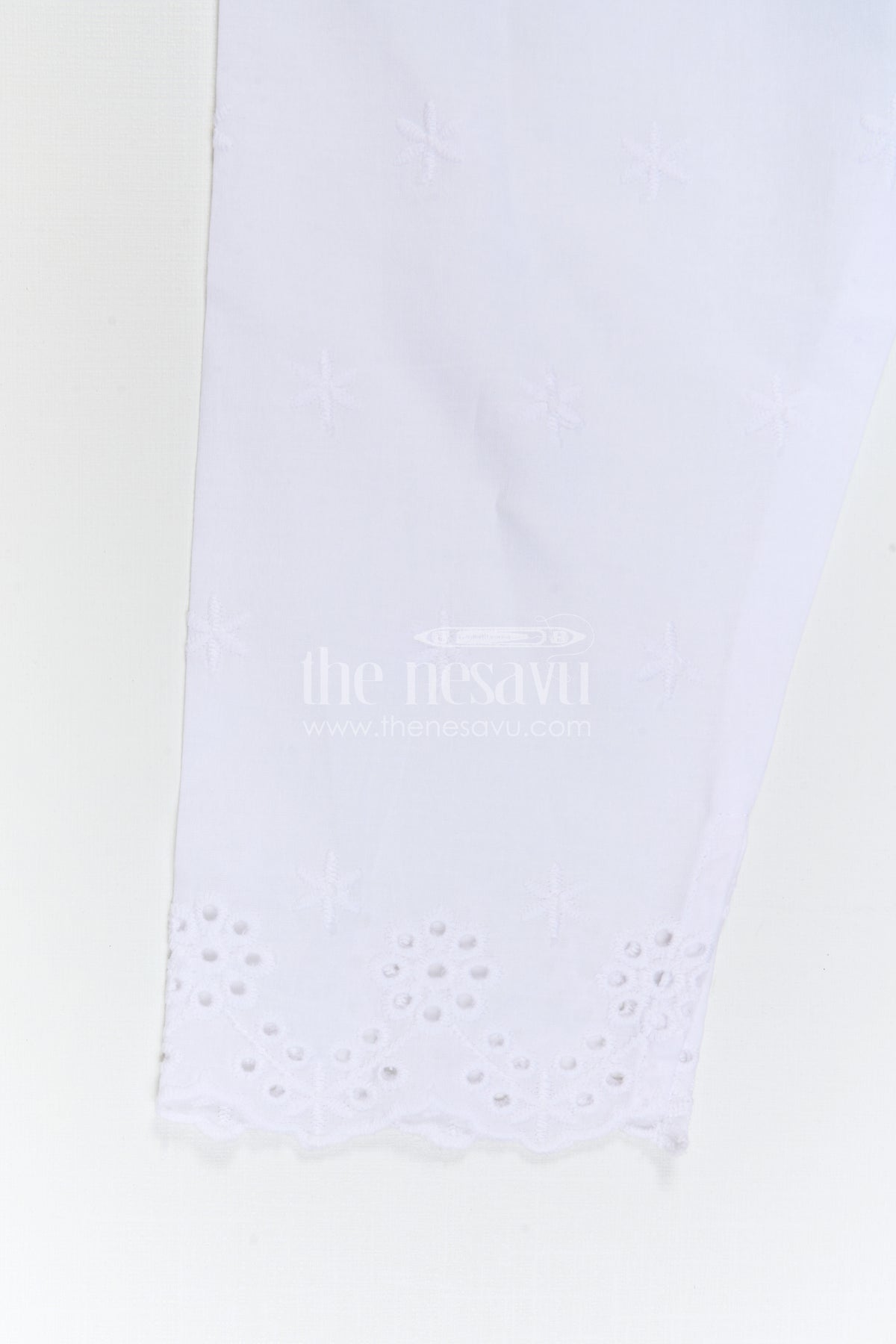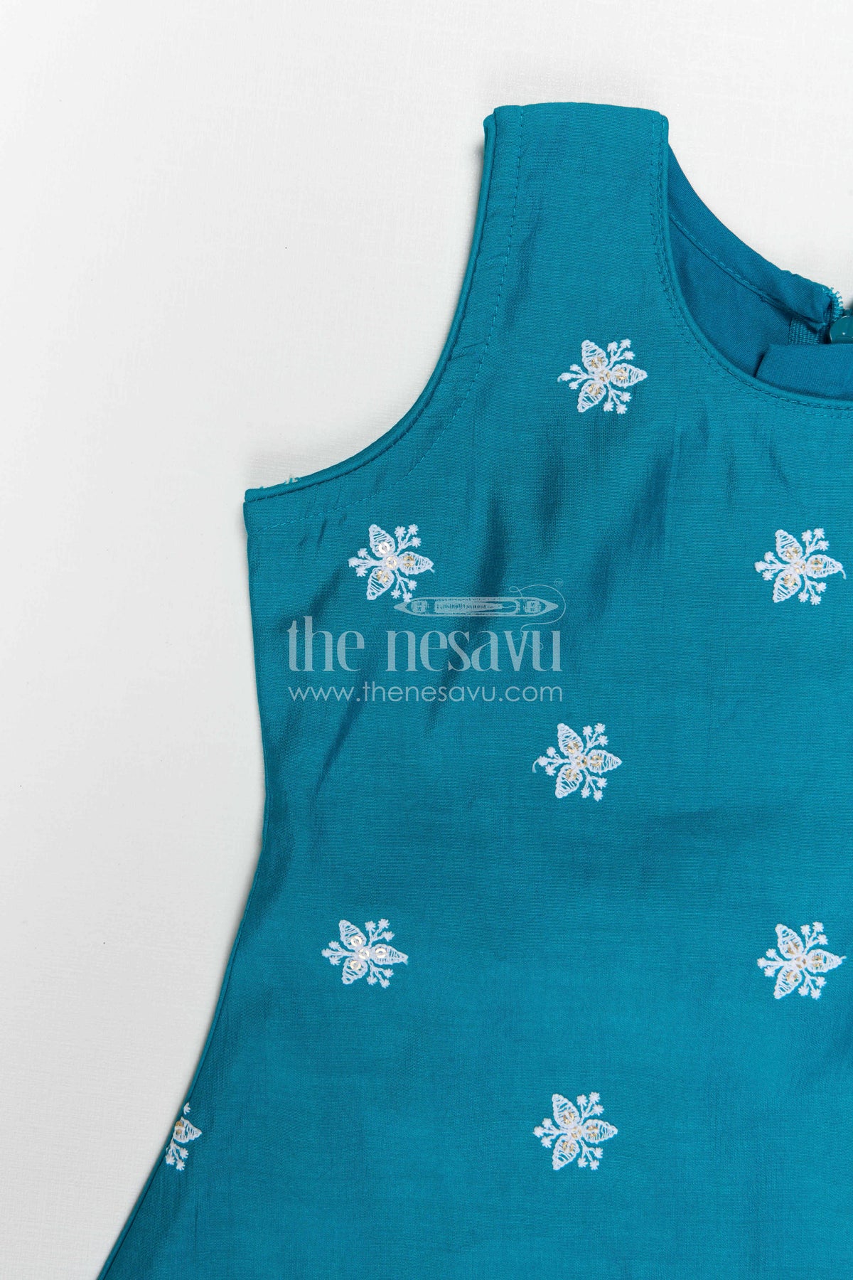 • This girls churidar set for family functions is made from crepe cotton with fine thread embroidery