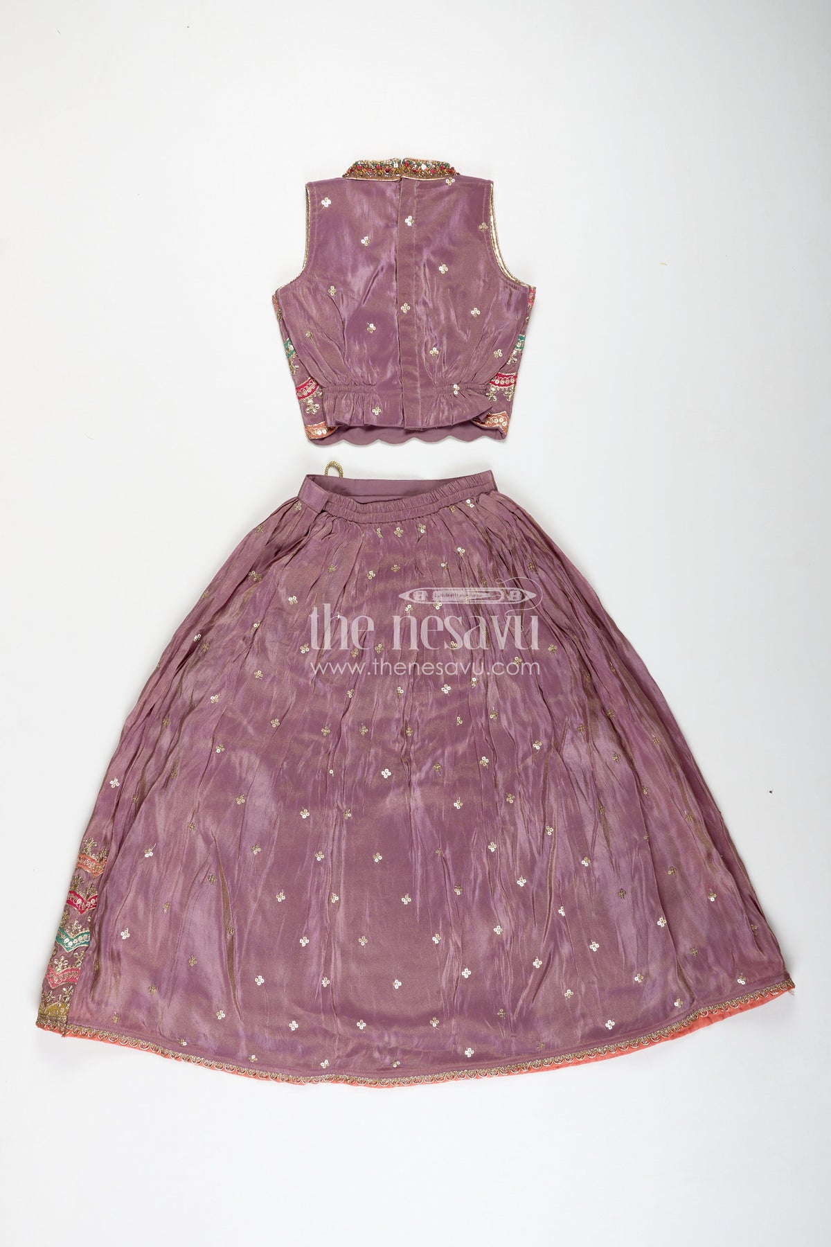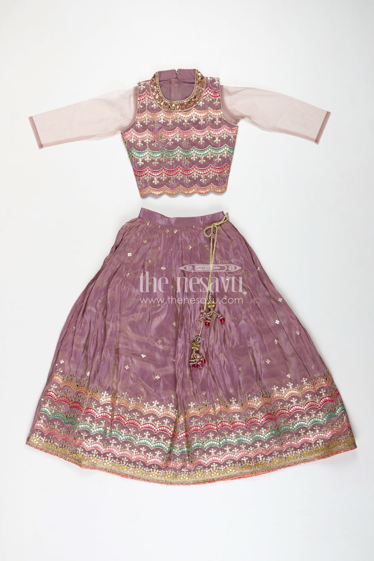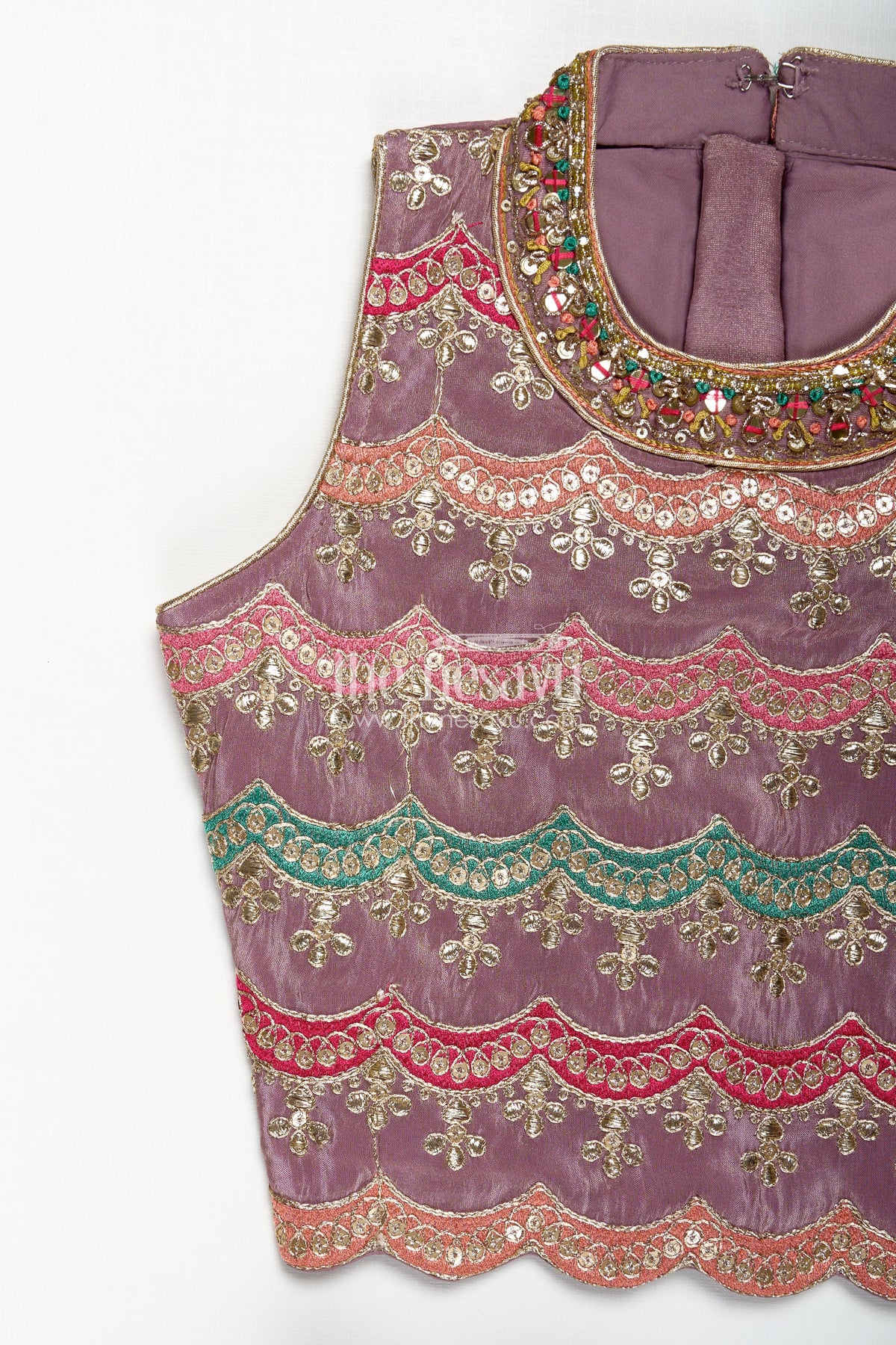 Crafted for festive elegance, this marriage function dress is a regal lehenga choli set designed in shimmering tissue fabric with detailed sequin embroidery. The sleeveless top stands out with a designer yoke featuring multicolor scalloped embroidery, mirror accents, and a statement neckline. The flared lehenga skirt is equally charming with coordinated border work and delicate motifs scattered throughout. A net dupatta with decorative trim and matching inner wear completes the look. This outfit is perfect for marriage functions, festive events, and celebrations where style and tradition meet.