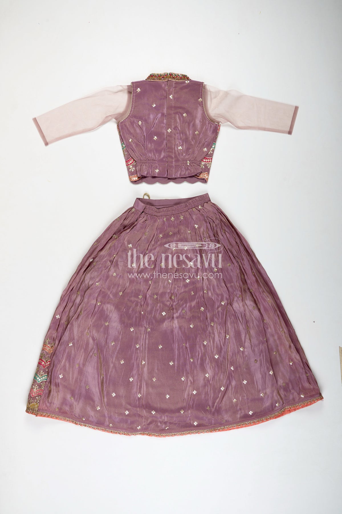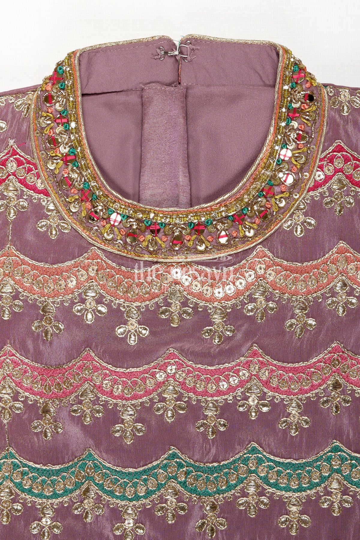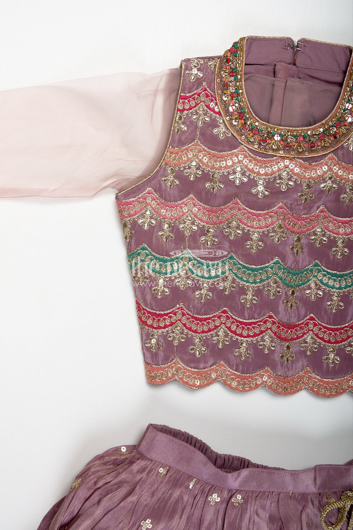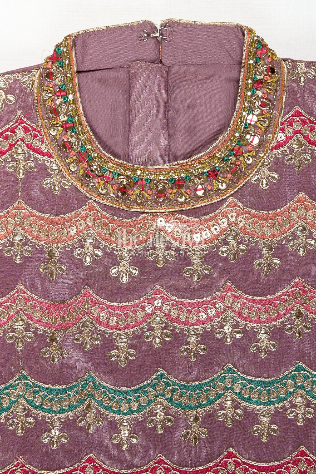 Crafted for festive elegance, this marriage function dress is a regal lehenga choli set designed in shimmering tissue fabric with detailed sequin embroidery. The sleeveless top stands out with a designer yoke featuring multicolor scalloped embroidery, mirror accents, and a statement neckline. The flared lehenga skirt is equally charming with coordinated border work and delicate motifs scattered throughout. A net dupatta with decorative trim and matching inner wear completes the look. This outfit is perfect for marriage functions, festive events, and celebrations where style and tradition meet.