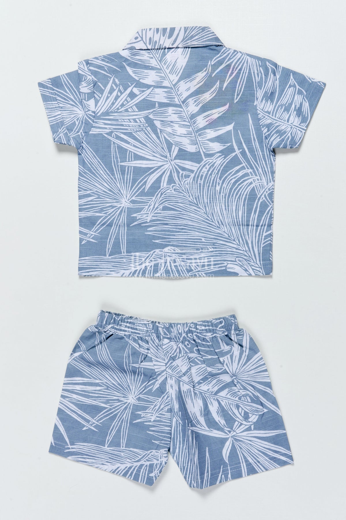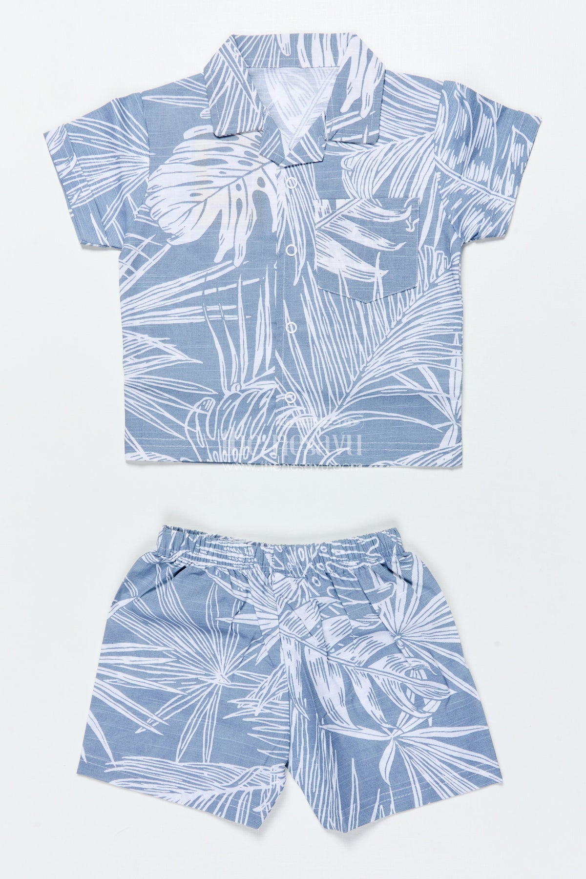 - This boys casual set includes a button-down printed shirt and matching shorts