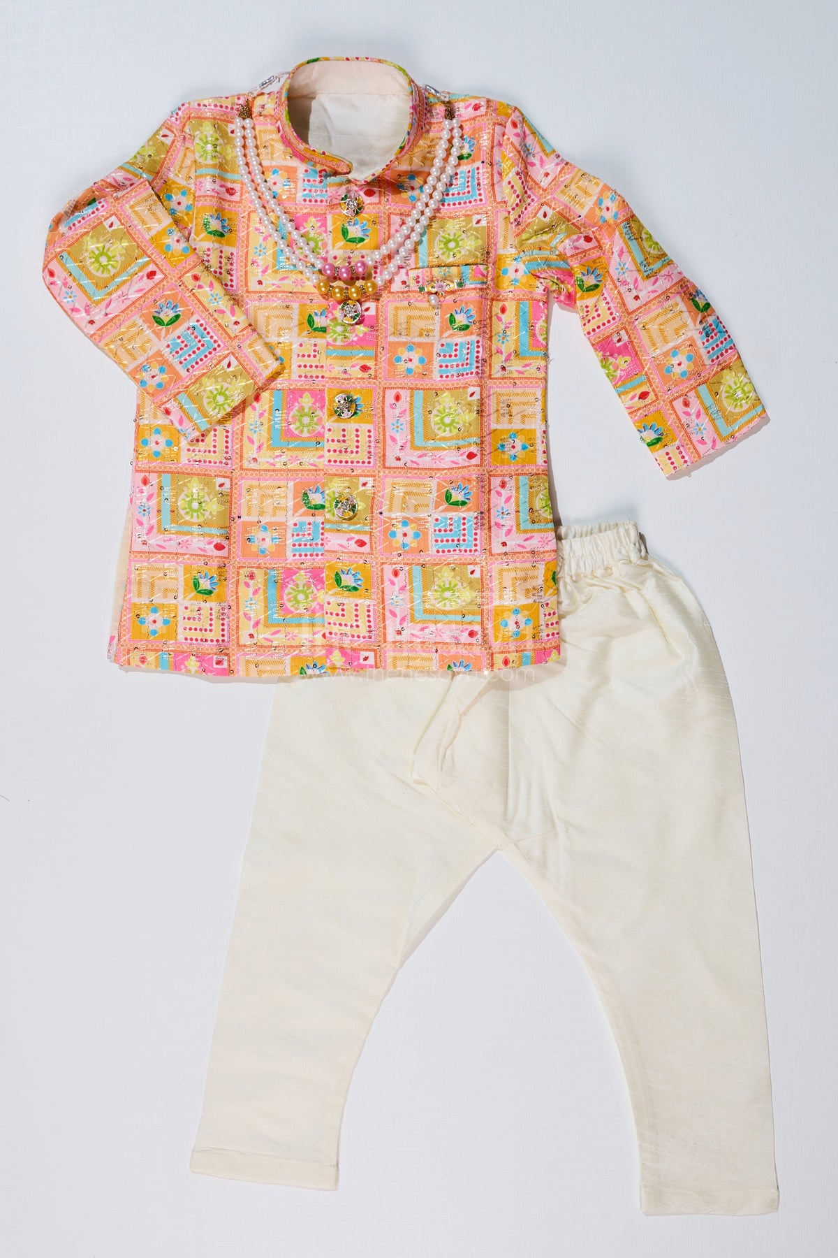 This boys light pink kurta is a charming and elegant choice for festive celebrations and traditional events. The blend silk kurta features a vibrant embroidered jacket with intricate digital prints, adding a regal touch to the ensemble. The soft, cream-colored dhoti ensures a comfortable fit, making it perfect for weddings, family gatherings, and cultural occasions. The unique pattern and bright color combination create a stylish ethnic look while keeping your little one comfortable. Complete with matching embroidered footwear, this set brings a touch of grandeur to any festive wardrobe.