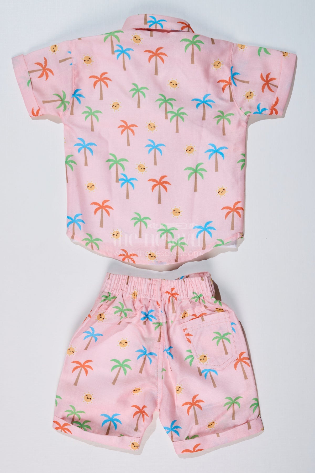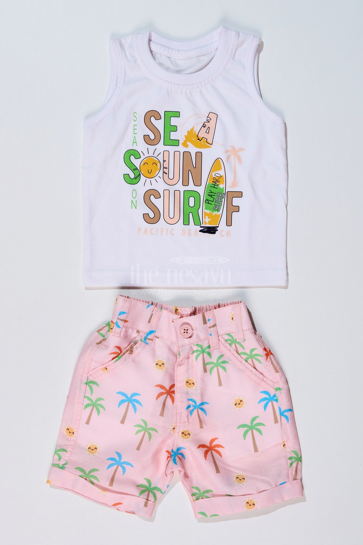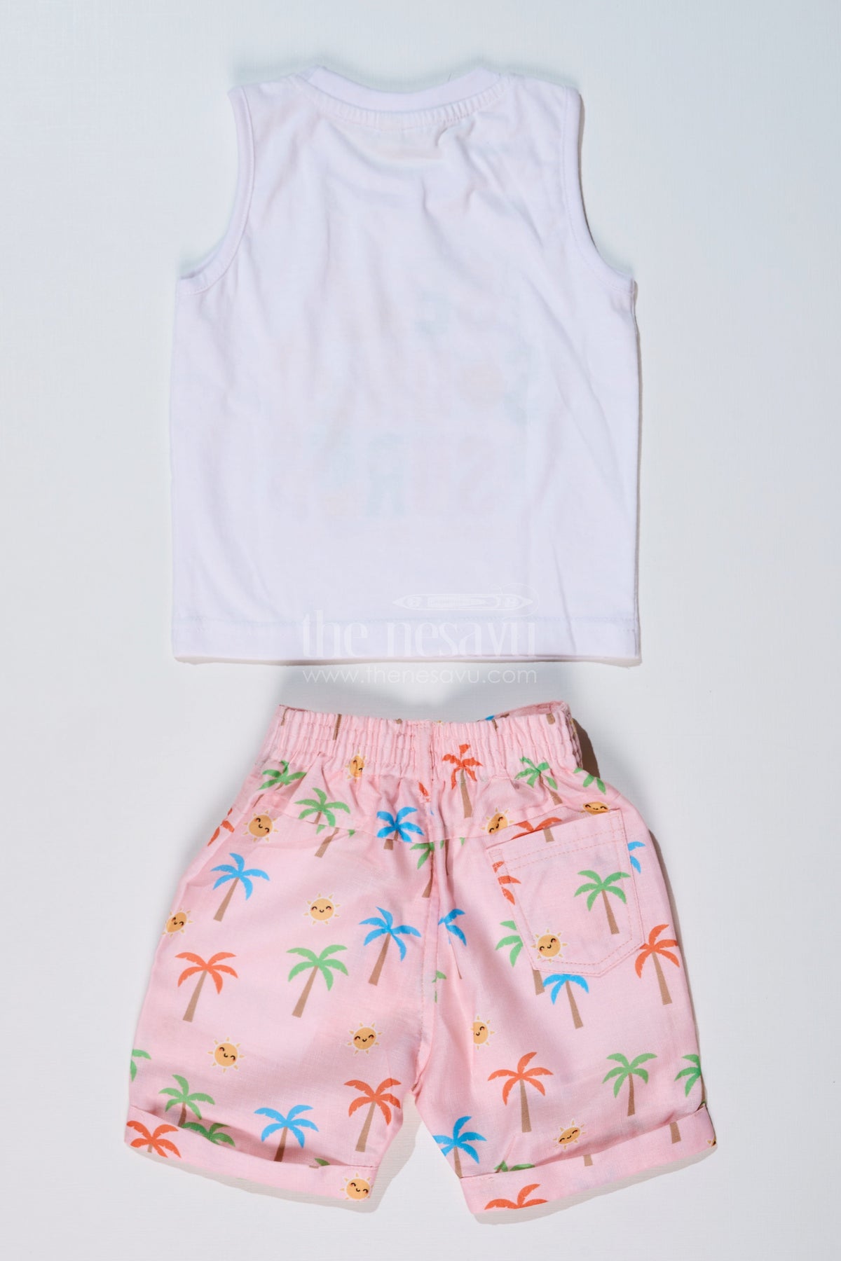 This boys party wear casual shirts set is designed for tropical vibes and fun summer adventures. The pink short-sleeved button-up shirt and matching shorts feature colorful palm tree prints, creating a relaxed beachwear look. The white sleeveless tank top with a playful surf-themed graphic adds an extra element of style. Made from soft cotton fabric, this set ensures comfort while keeping your child stylish for vacations, beach trips, or casual outings.