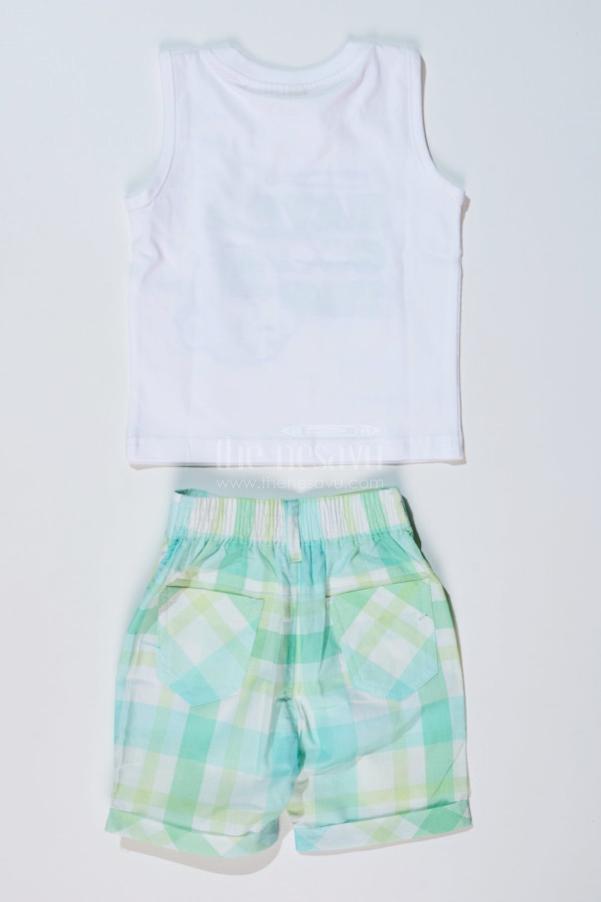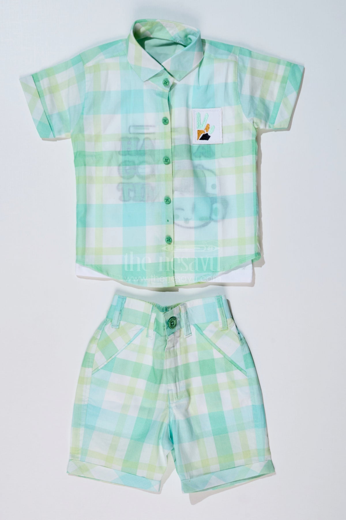 This boys smart casual shirts set is a stylish and comfortable choice for everyday wear. The set includes a light green and white checked short-sleeved shirt, a soft cotton sleeveless graphic T-shirt, and matching checked shorts. Designed for both style and comfort, this outfit is perfect for casual outings, summer vacations, and playdates. The breathable cotton fabric ensures all-day freshness, while the trendy graphic print on the T-shirt adds a playful touch.