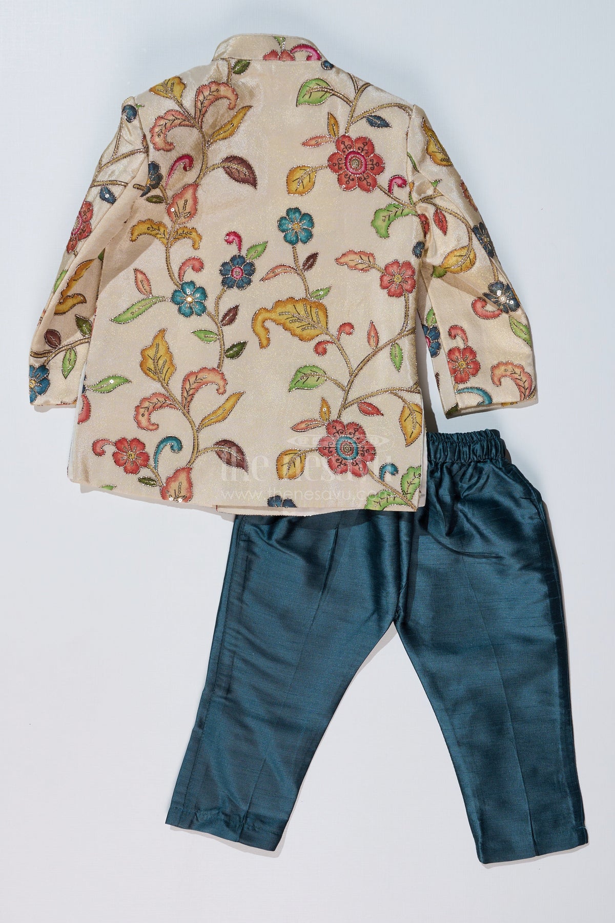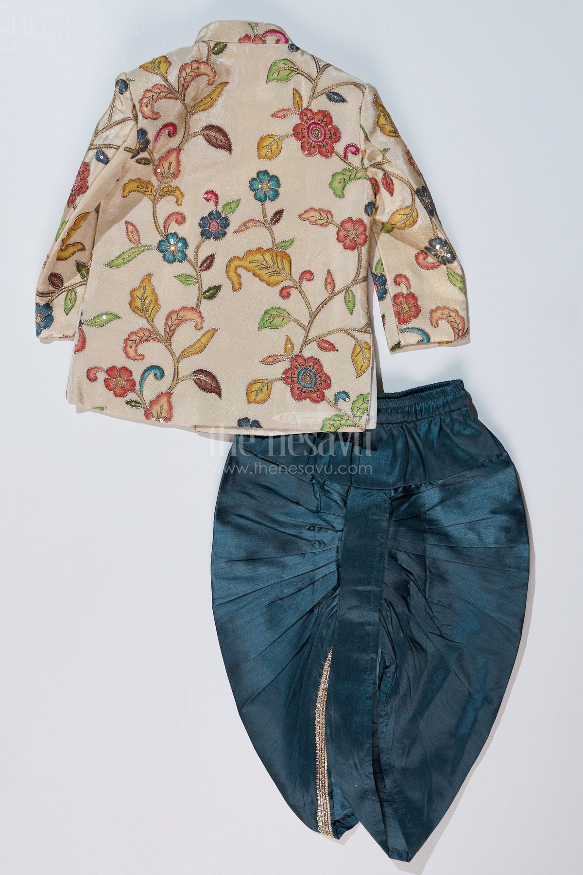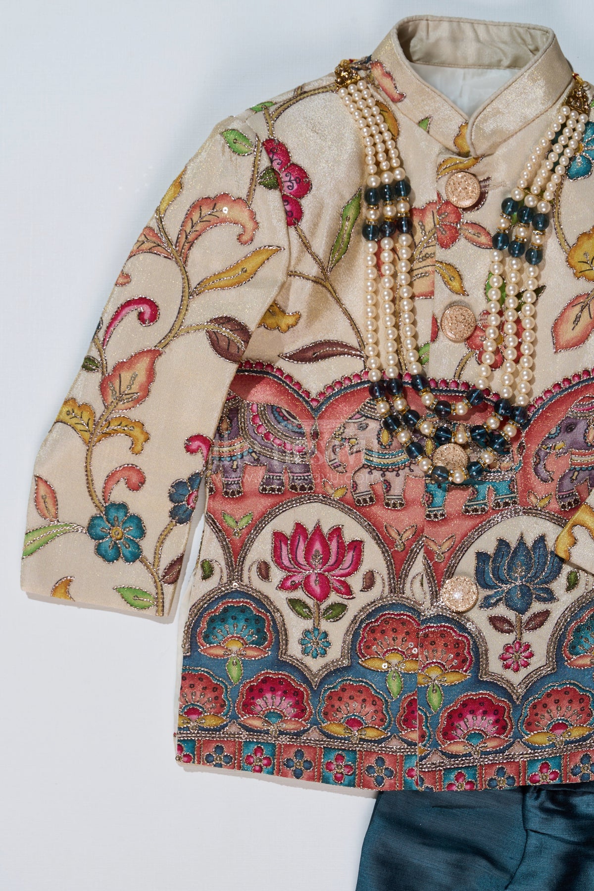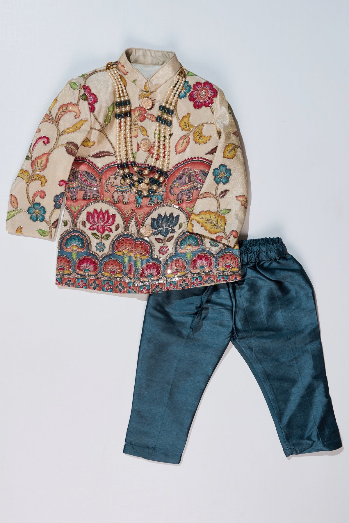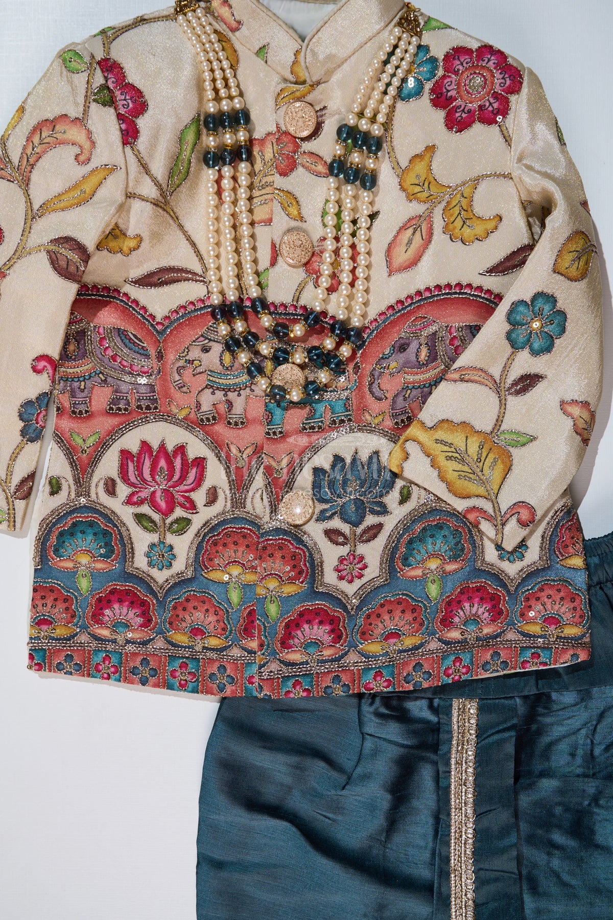 This boys cream sherwani is a perfect blend of traditional grandeur and contemporary elegance. Featuring an intricate digital print with regal floral and elephant motifs, this sherwani brings a touch of heritage to your child's wardrobe. The pearl embellishments and structured mandarin collar add an extra layer of sophistication. Paired with a contrasting teal dhoti, the outfit offers a majestic look suitable for weddings, receptions, and festive celebrations. Made from pure viscose tissue fabric, it ensures a soft and luxurious feel while keeping your child comfortable.