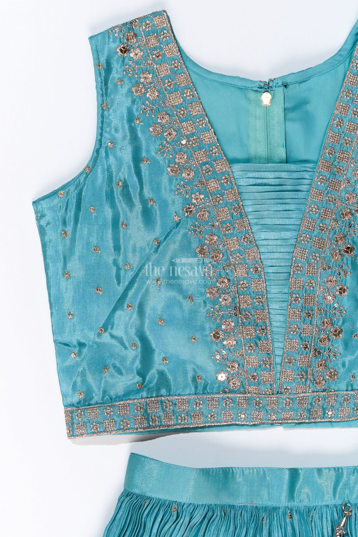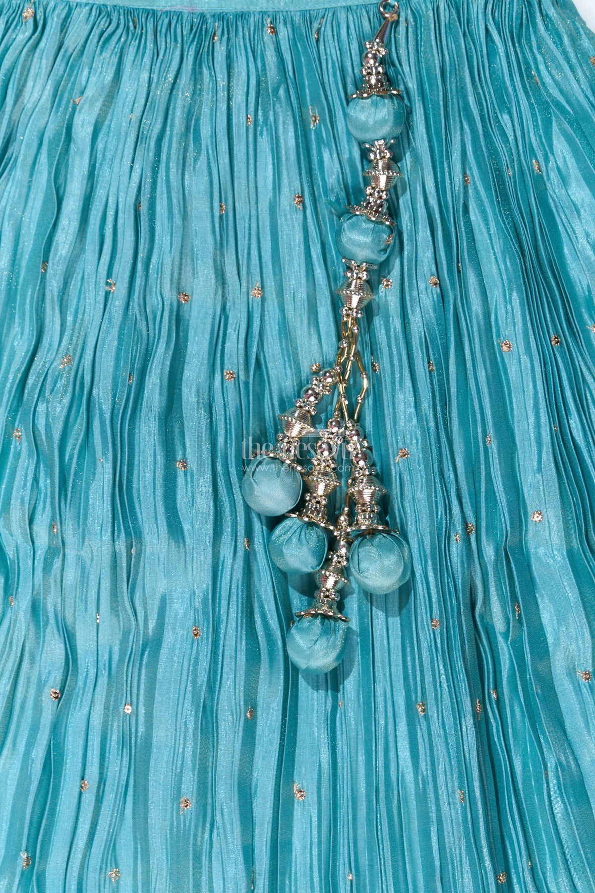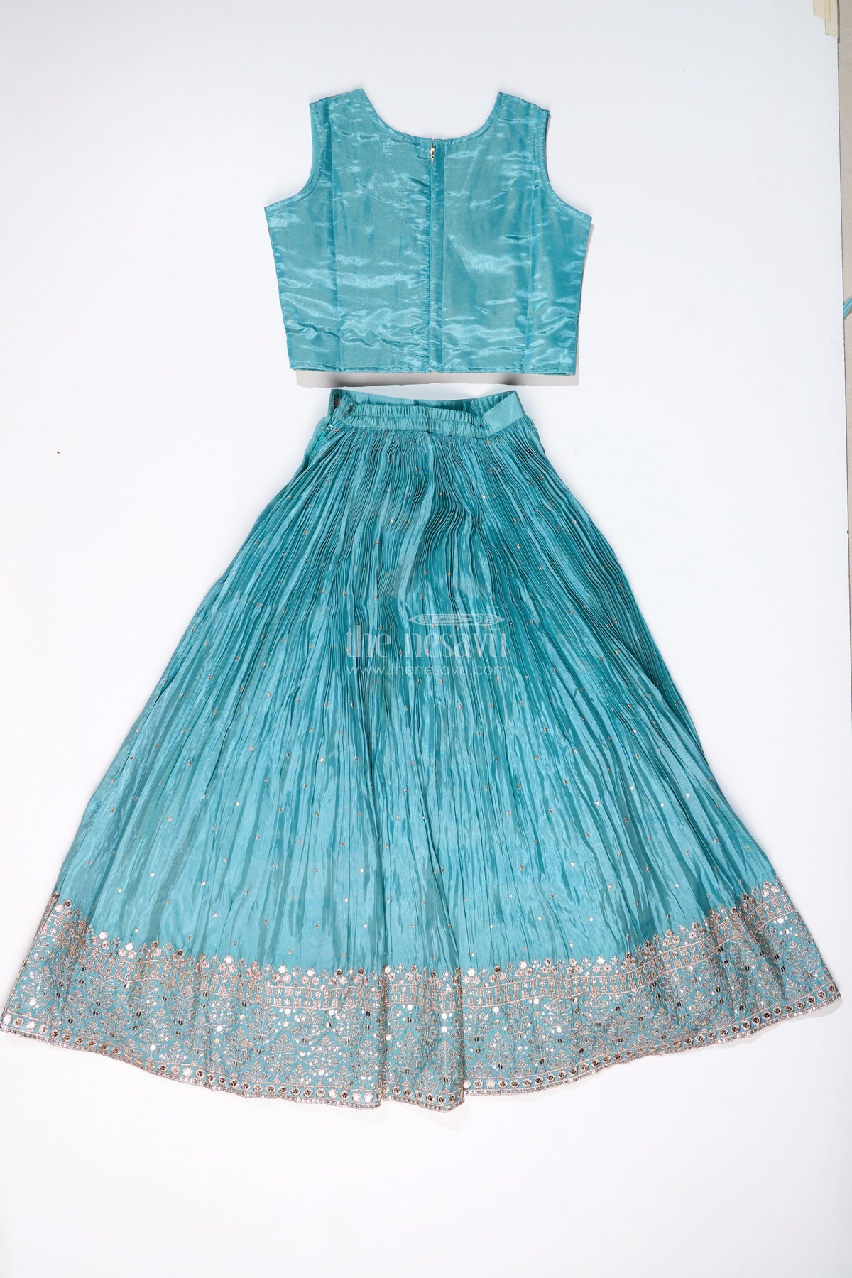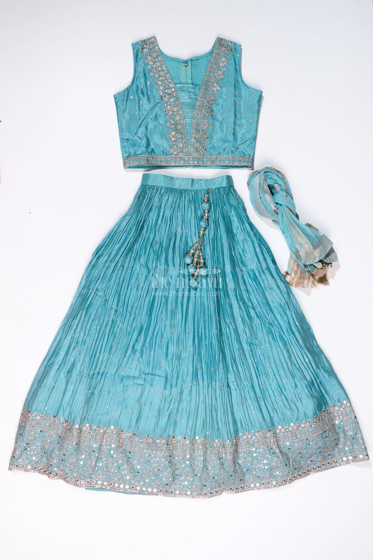 This elegant long choli lehenga for girls is designed for grand celebrations, offering a stunning combination of tradition and modern flair. Made from premium viscose shimmer chinon silk, the outfit drapes beautifully, giving it a graceful appeal. The sleeveless choli is adorned with intricate mirror and sequin work, adding a radiant sparkle. The flowing pleated lehenga features delicate embellishments and a richly embroidered border for a regal touch. Paired with a matching dupatta featuring elegant tassels, this set is perfect for weddings, festive occasions, and special events. Lightweight and comfortable, this lehenga ensures effortless movement and a breathtaking look.