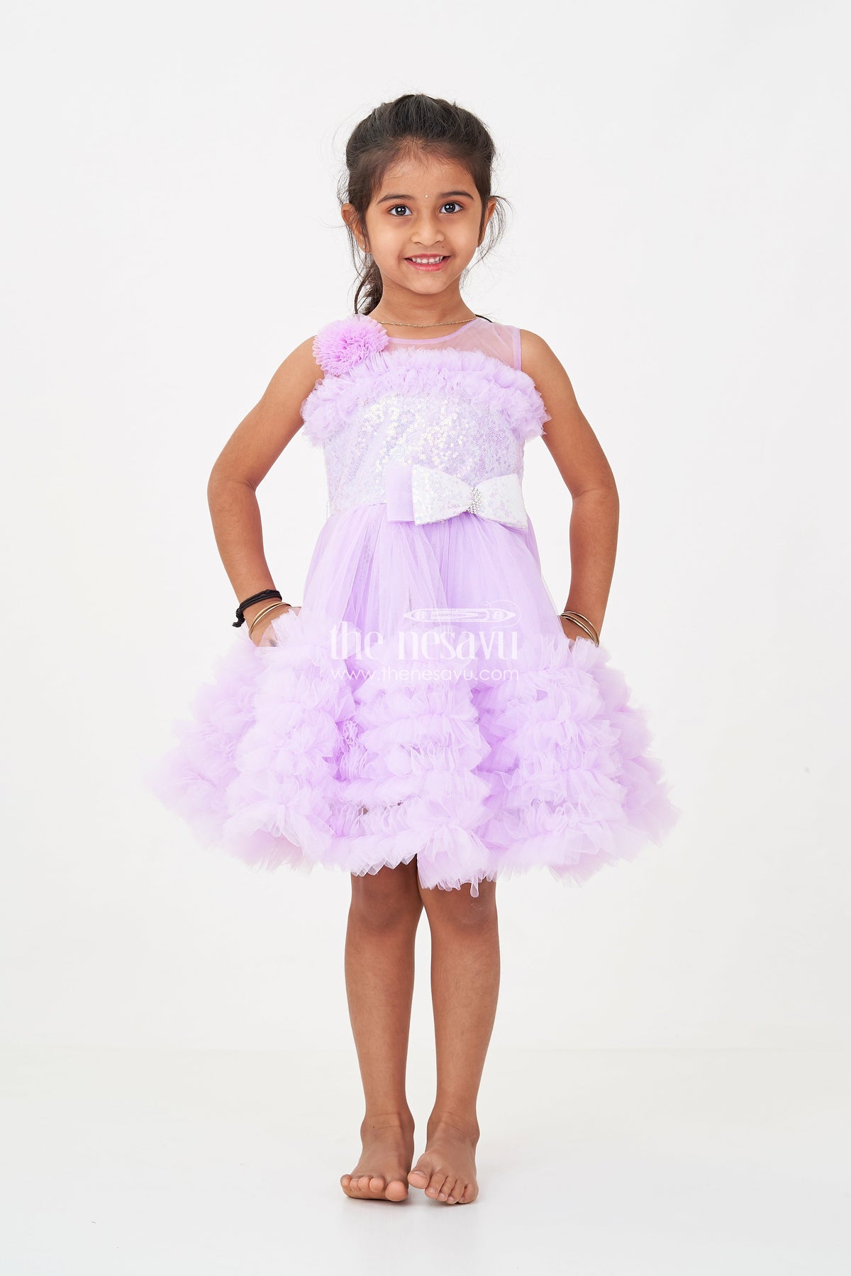 The Nesavu Girls Fancy Party Frock Elegant Purple Short Party Frock for Girls with Sequin Bodice and Ruffled Layers Nesavu Nesavu Purple Short Party Frock Girls Floral Sequin Detailing Ruffled Net Skirt