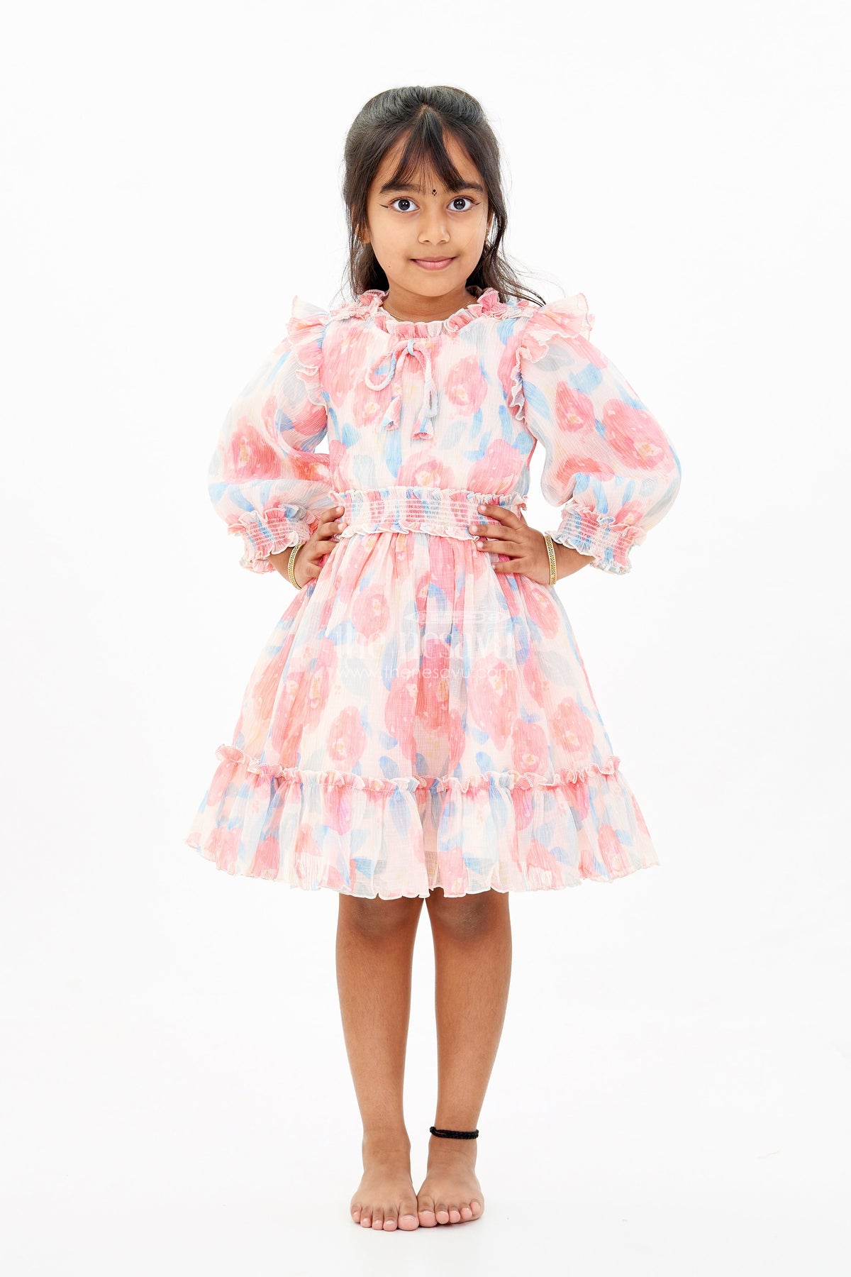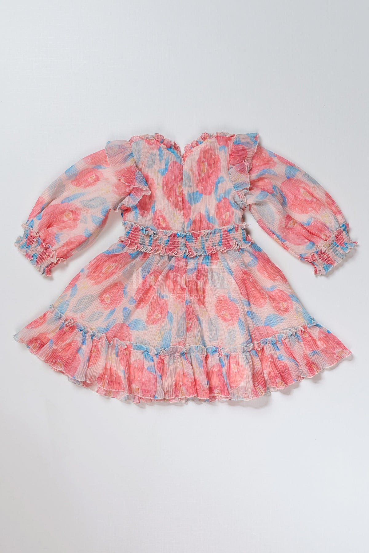 This beautiful cotton frock is a charming and stylish choice for casual outings, playdates, and special occasions. Crafted from designer-printed pleated organza, this dress features a delicate floral print in soft pastel hues. The ruffled neckline, smocked waist, and long puff sleeves add a touch of elegance, making it a perfect blend of comfort and fashion. The lightweight fabric ensures breathability, making it ideal for summer wear. Let your little one twirl in this delightful dress for a picture-perfect look.