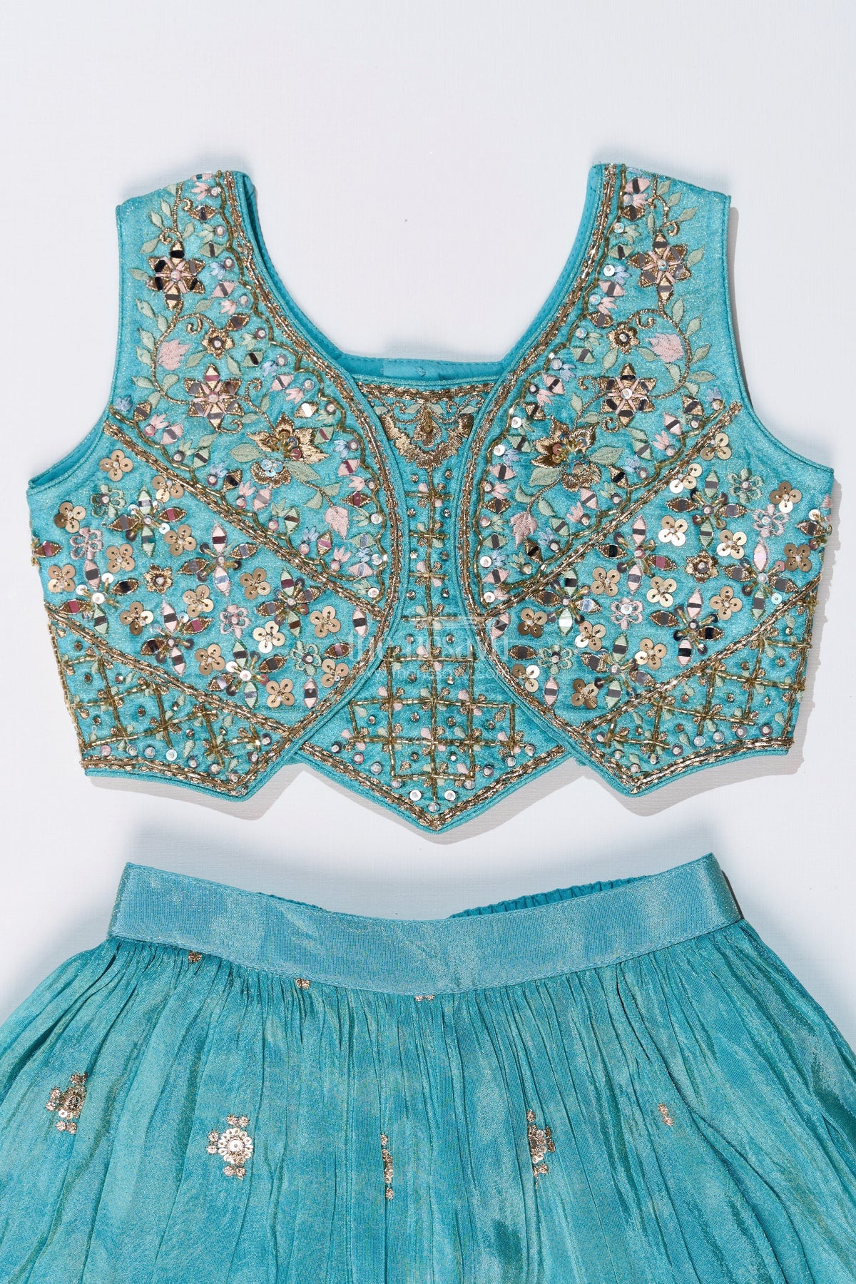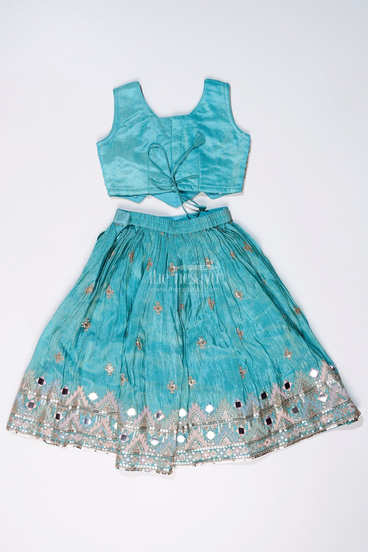 This party lehenga dress is a dazzling choice for special occasions like weddings, receptions, and festive gatherings. Made from pure tissue viscose silk, the outfit features a richly embroidered blouse adorned with intricate mirror and threadwork, giving it a luxurious appeal. The pleated lehenga shimmers with delicate embellishments, while the soft pink dupatta with sequin accents adds a charming contrast. Designed to provide both comfort and elegance, this lehenga set ensures your little one looks effortlessly stylish and graceful at every celebration.