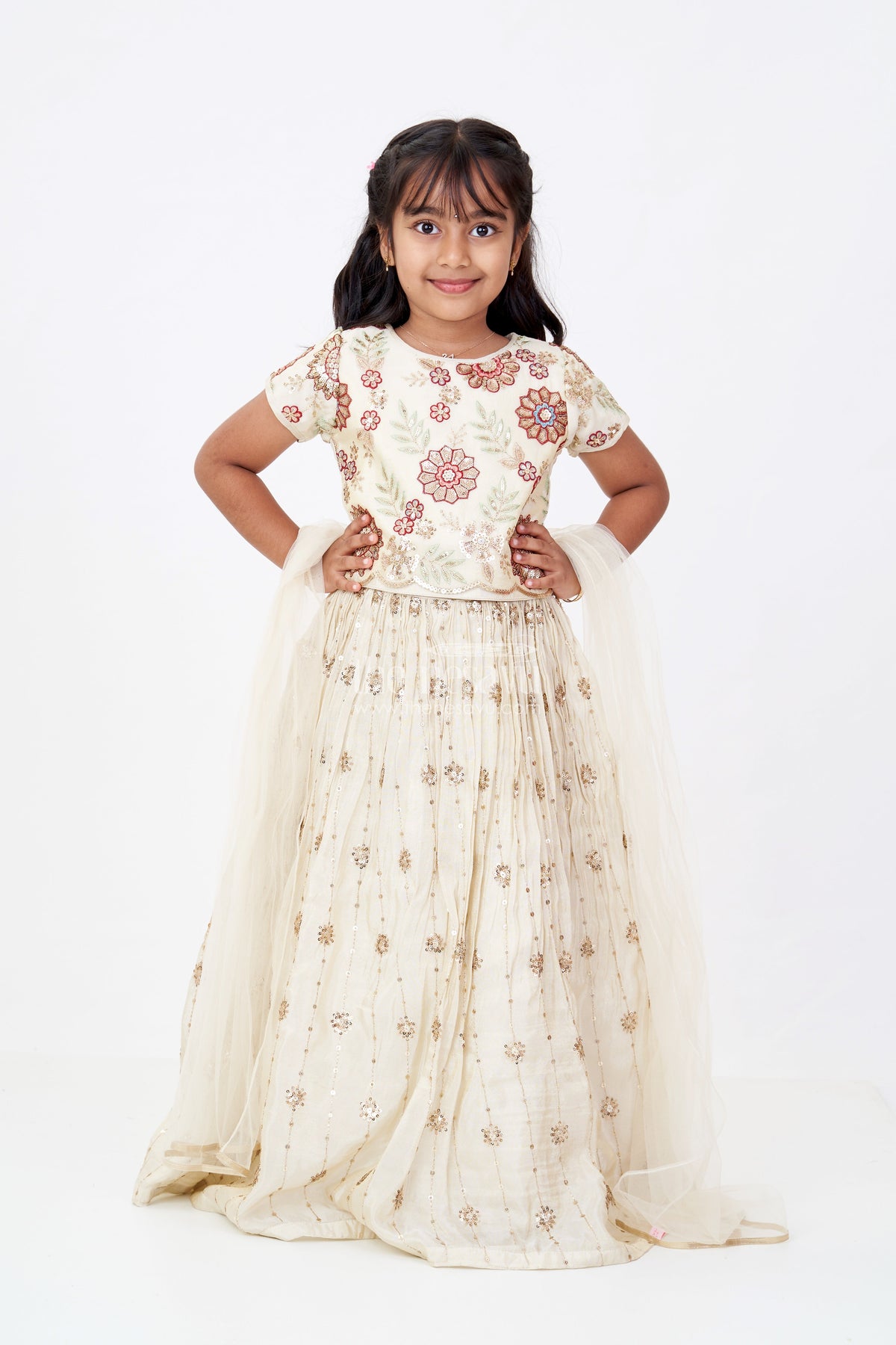 This cream lehenga choli is a perfect blend of tradition and elegance, designed for young girls who love to dress up for festive occasions. Crafted from pure shimmer viscose silk, the short-sleeved choli is adorned with intricate floral embroidery, sequins, and beadwork, making it a standout piece. The flared lehenga flows beautifully, offering a graceful silhouette, while the matching soft net dupatta adds a regal touch. Ideal for weddings, receptions, and festivals, this lehenga choli set will make your child shine with sophistication and charm.