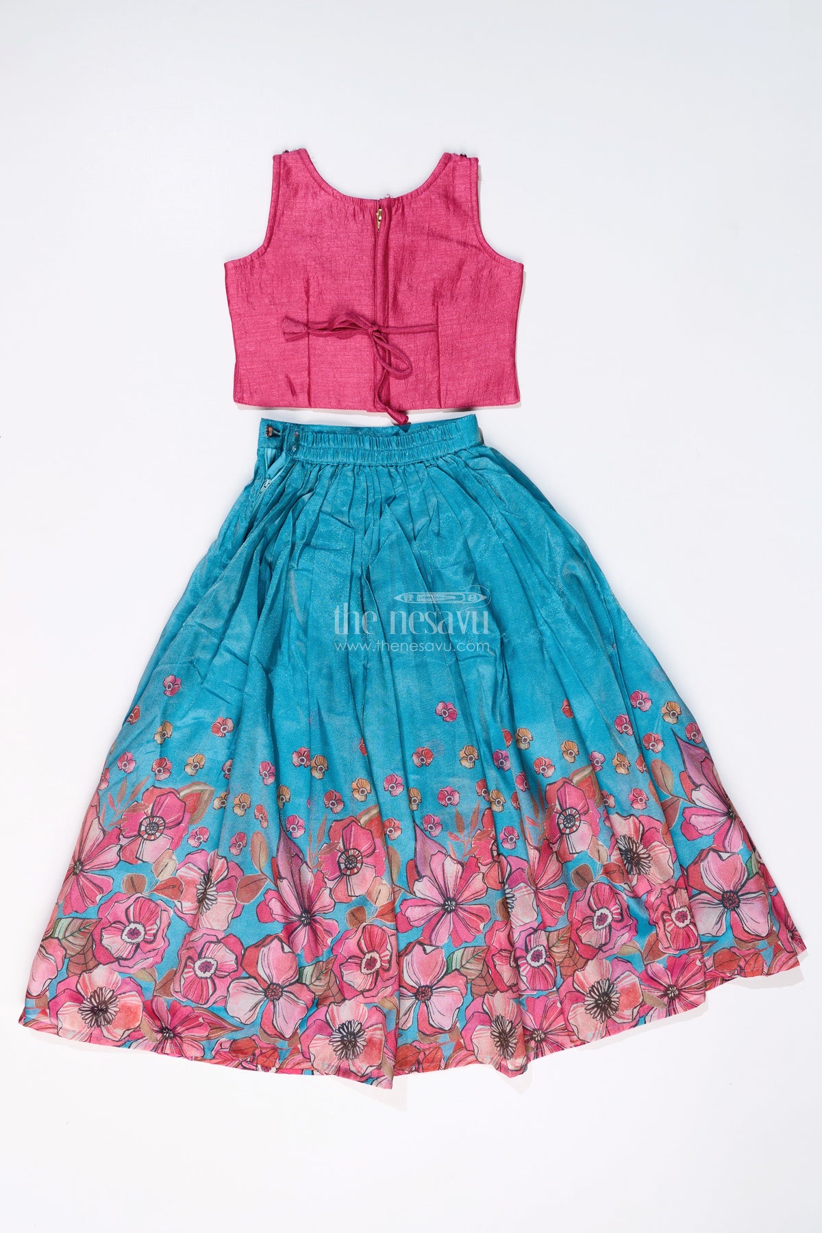 This lehenga choli party wear set is a vibrant and stylish outfit, designed to make a statement at festive events and weddings. The sleeveless pink choli is adorned with delicate embroidery, paired with a flared teal lehenga featuring bold digital floral prints. The highlight of this ensemble is the matching floral-printed jacket, adding a contemporary twist to the traditional lehenga set. Lightweight and comfortable, this outfit is perfect for your little fashionista who loves to stand out.