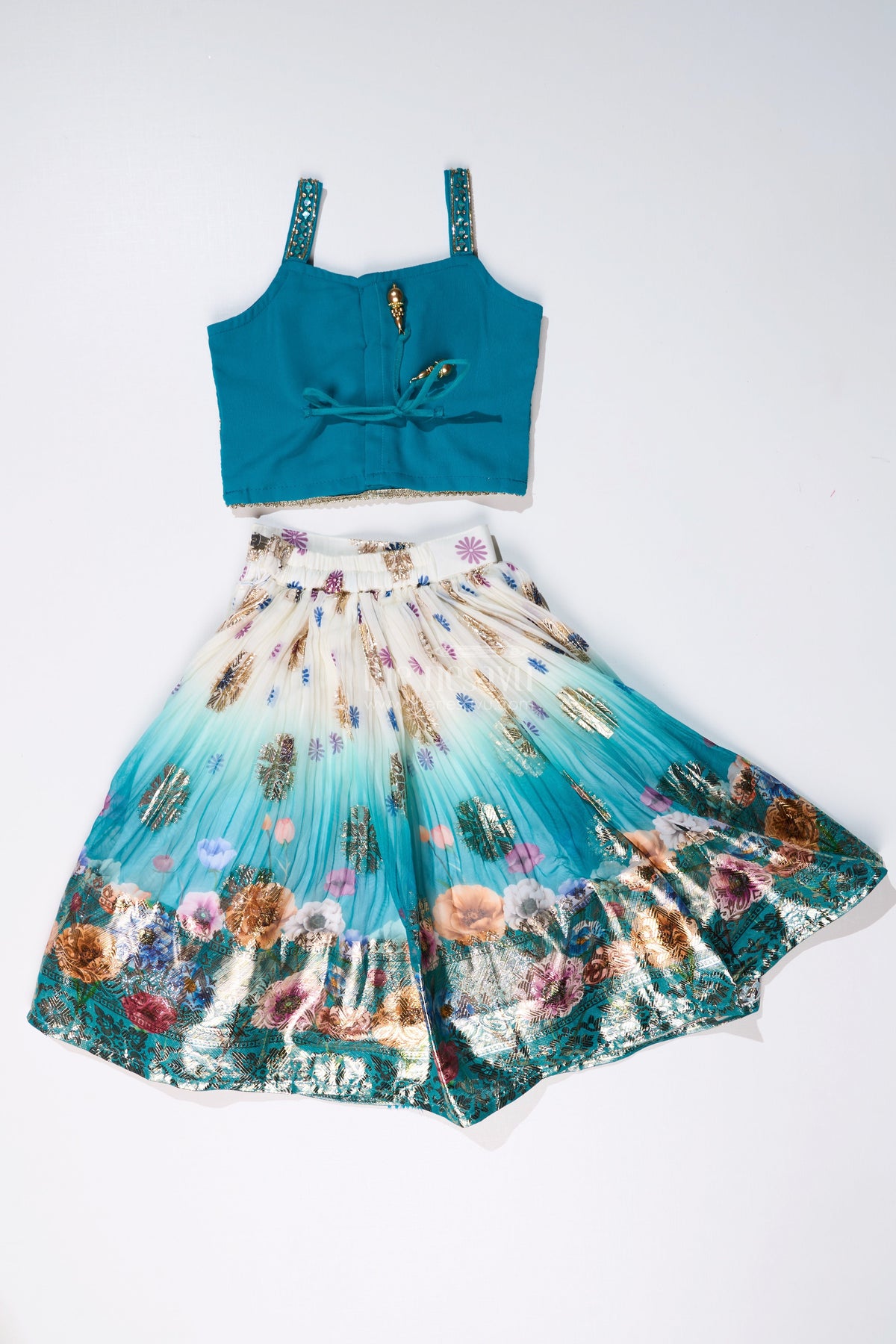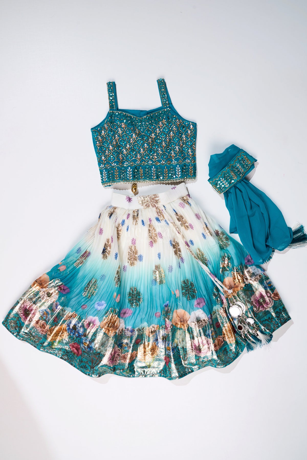 This exquisite mirror work lehenga design is a perfect blend of tradition and glamour, making it an ideal choice for weddings and grand celebrations. The beautifully handcrafted blouse is adorned with intricate mirror work and embroidery, giving it a stunning appeal. Paired with a flowy georgette skirt featuring delicate floral motifs and shimmering embellishments, this lehenga set ensures a regal look for your little one. The lightweight fabric ensures comfort, while the stylish sleeveless choli and flared silhouette add elegance to every twirl. Perfect for festive gatherings, sangeet functions, and cultural events, this outfit is a must-have for special occasions.